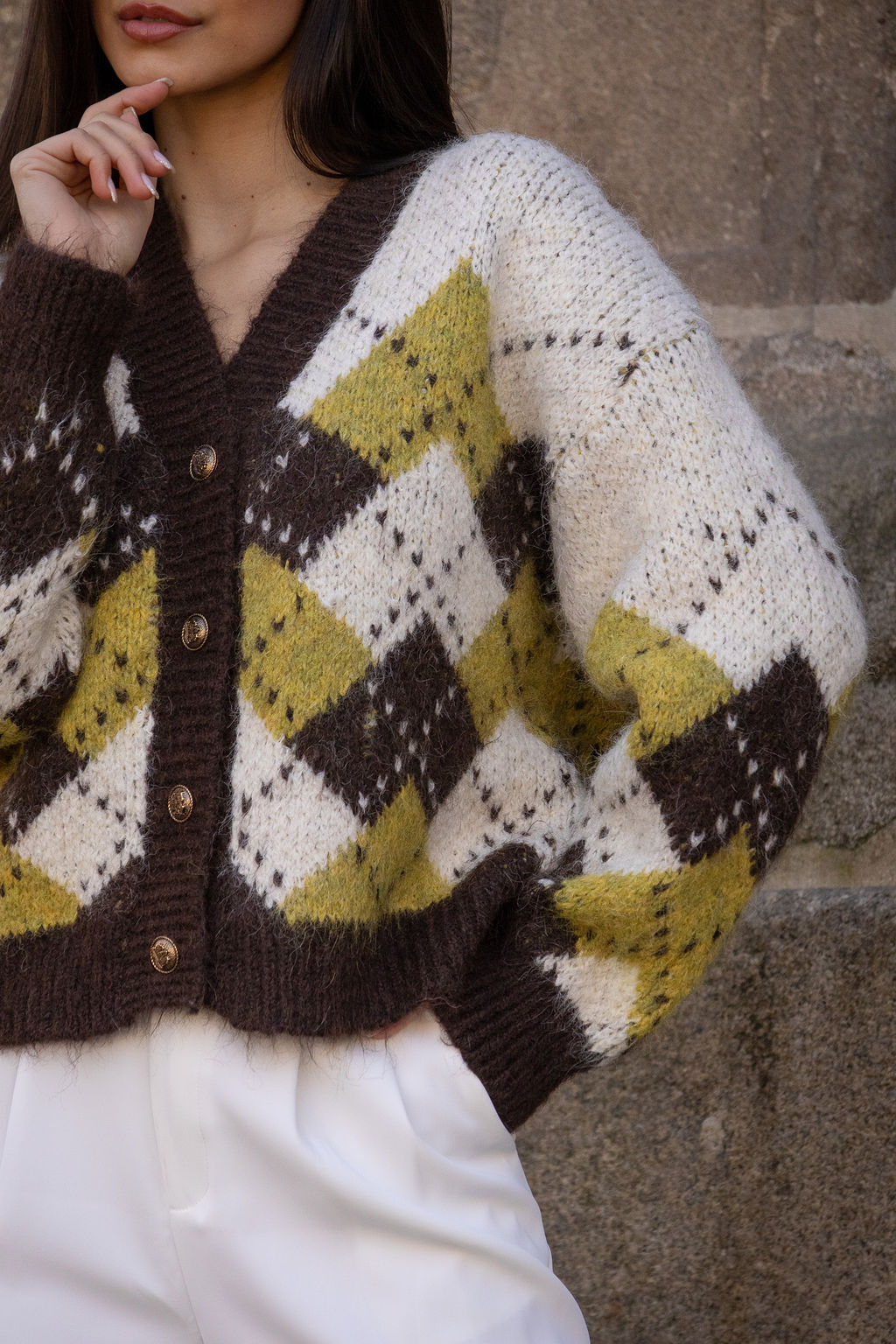 CASACO DE MALHA CASTANHO E VERDE COM PADRÃO LOSANGOS PONTO CHIC