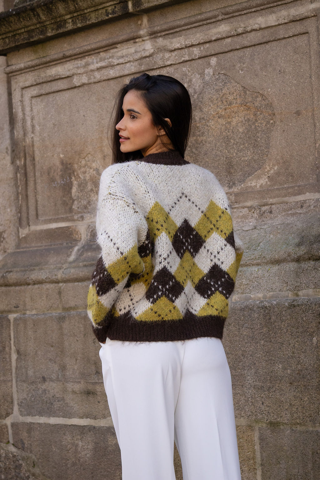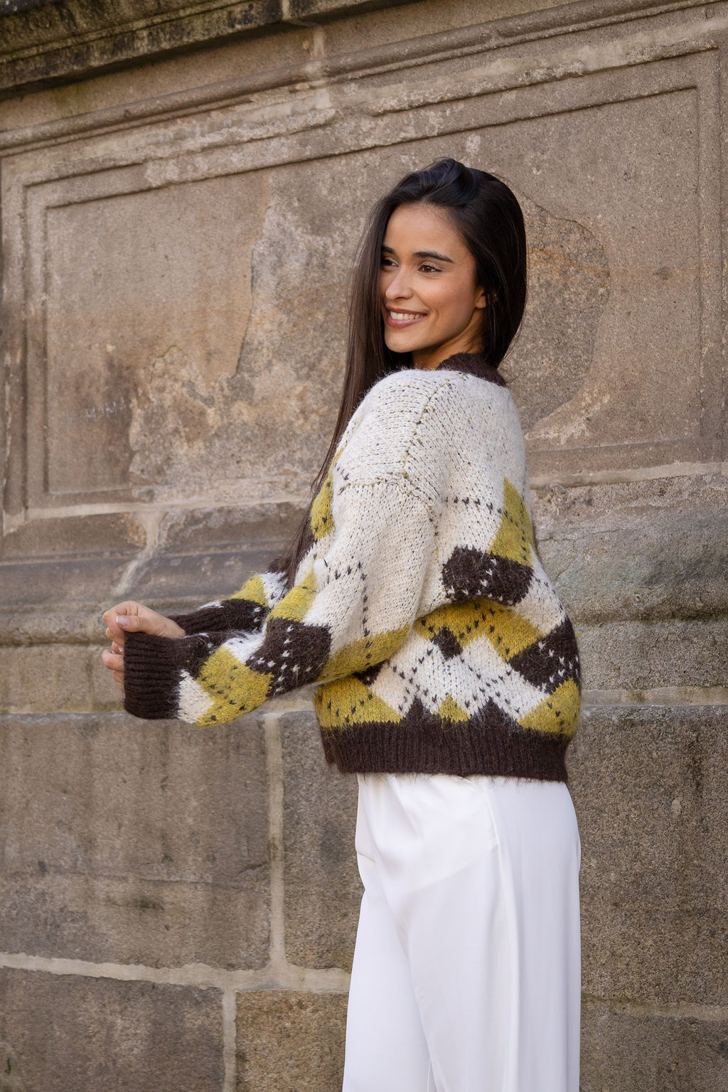 Aconchegante e cheio de personalidade, este casaco de malha castanho e verde destaca-se pelo padrão de losangos em tons contrastantes, que cria um visual clássico com um toque moderno. Confeccionado numa mistura de fibras que inclui lã, poliamida, poliéster e acrílico, garante conforto térmico, suavidade ao toque e uma estrutura agradável ao vestir.