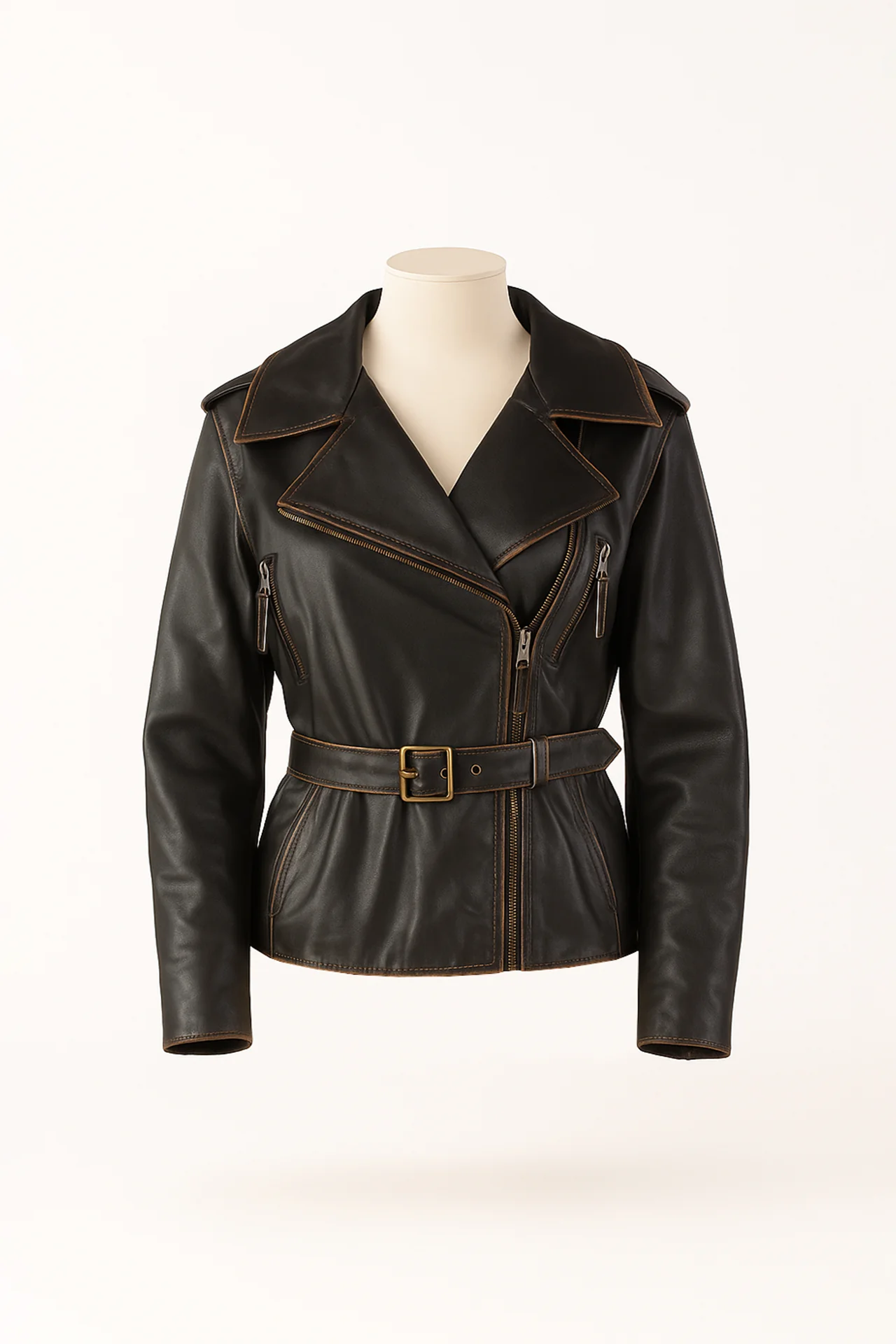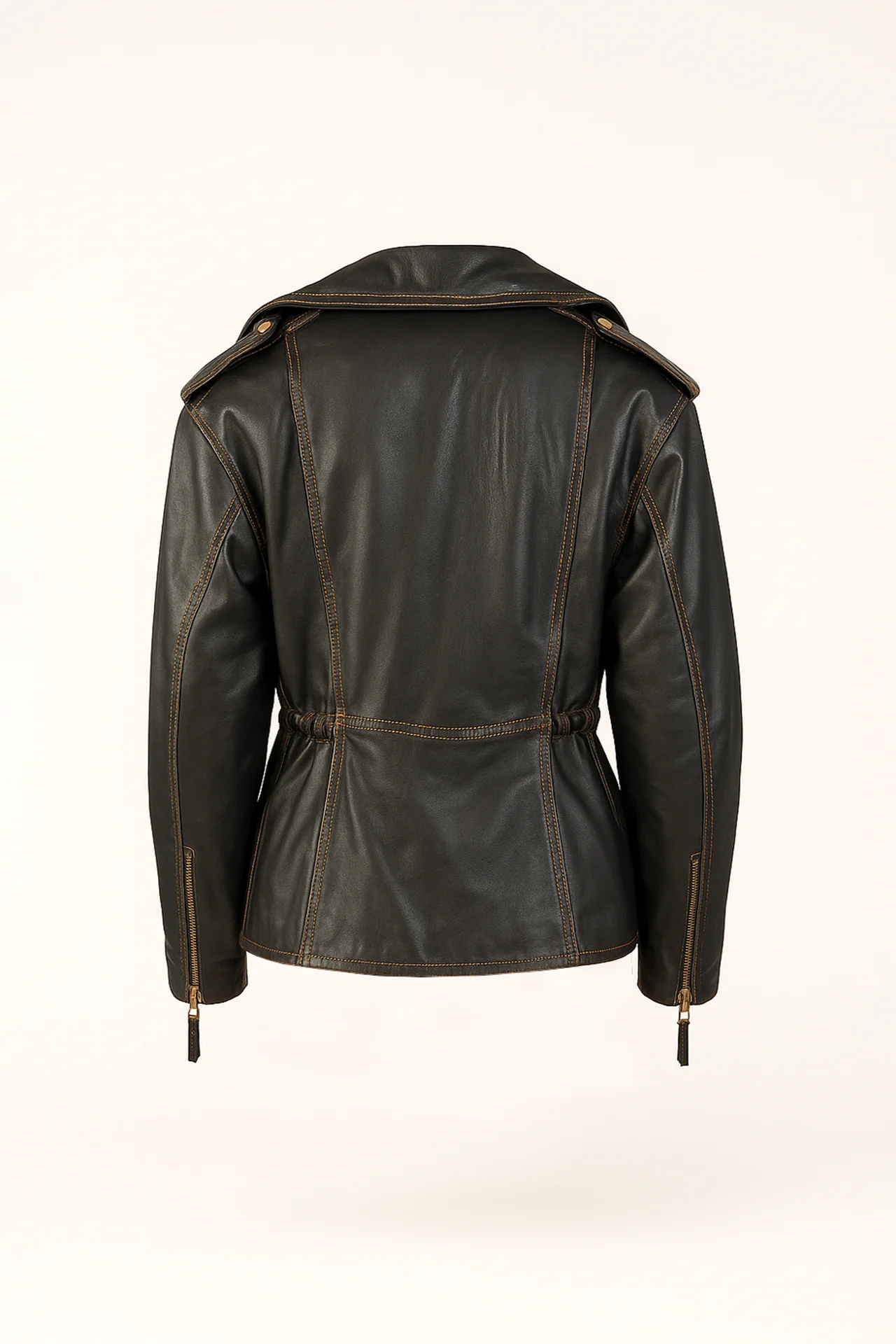 Com corte biker e estrutura cintada, este casaco Sahoco destaca-se pelos fechos metálicos dourados, lapelas amplas e cinto ajustável na cintura, que realçam a silhueta feminina com atitude. O detalhe franzido na parte posterior acrescenta movimento e um toque contemporâneo ao visual.