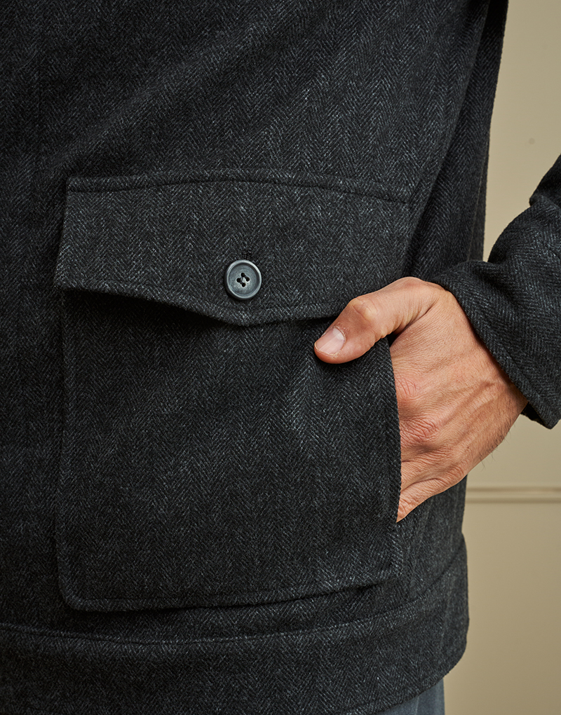 O design inclui gola clássica, corte reto e bolsos frontais com aba e botão, que adicionam funcionalidade e um toque sofisticado ao modelo. A textura subtil do tecido, as costuras bem definidas e o acabamento cuidado reforçam o caráter contemporâneo e elegante desta peça.