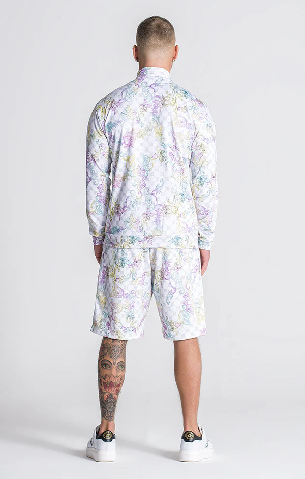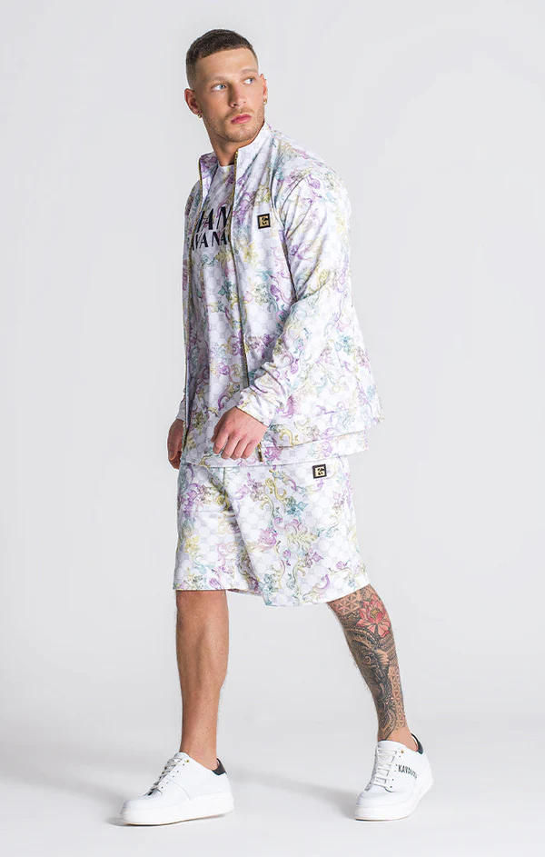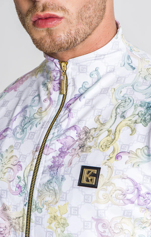O estampado artístico em tons suaves de lilás, verde, bege e dourado cria um efeito visual elegante e moderno, complementado pelo fecho metálico dourado e o logótipo GK aplicado no peito.