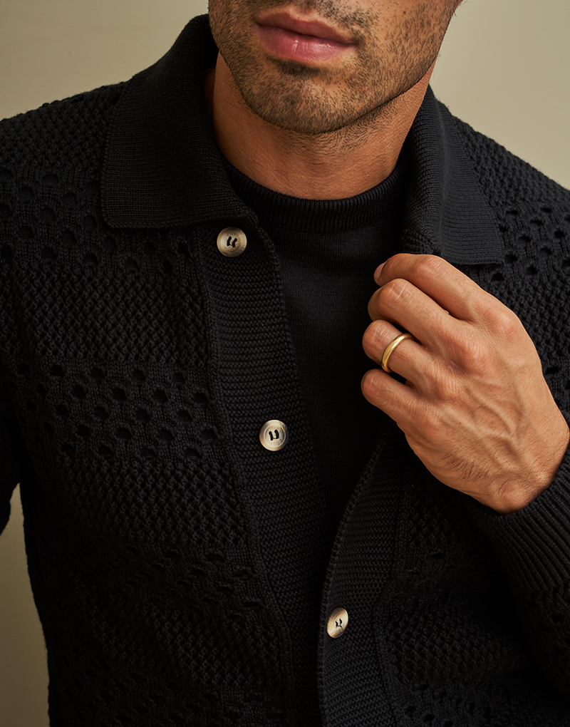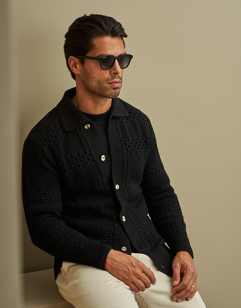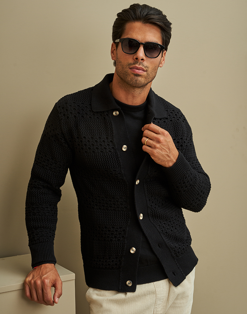 O design combina malha perfurada e zonas de ponto fechado, criando um efeito visual sofisticado e moderno. A gola polo, os botões frontais e os bolsos discretos adicionam um toque clássico à peça, equilibrando na perfeição o lado artesanal com um estilo contemporâneo.
