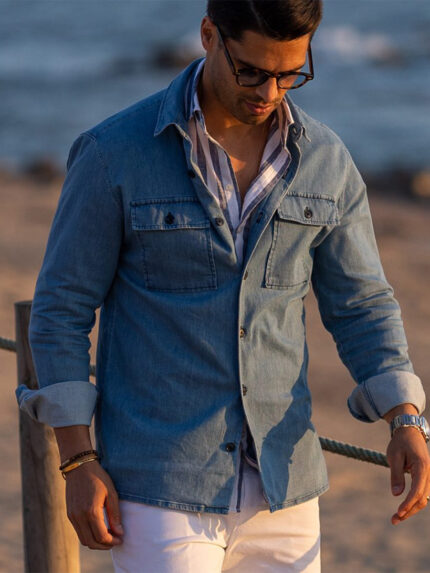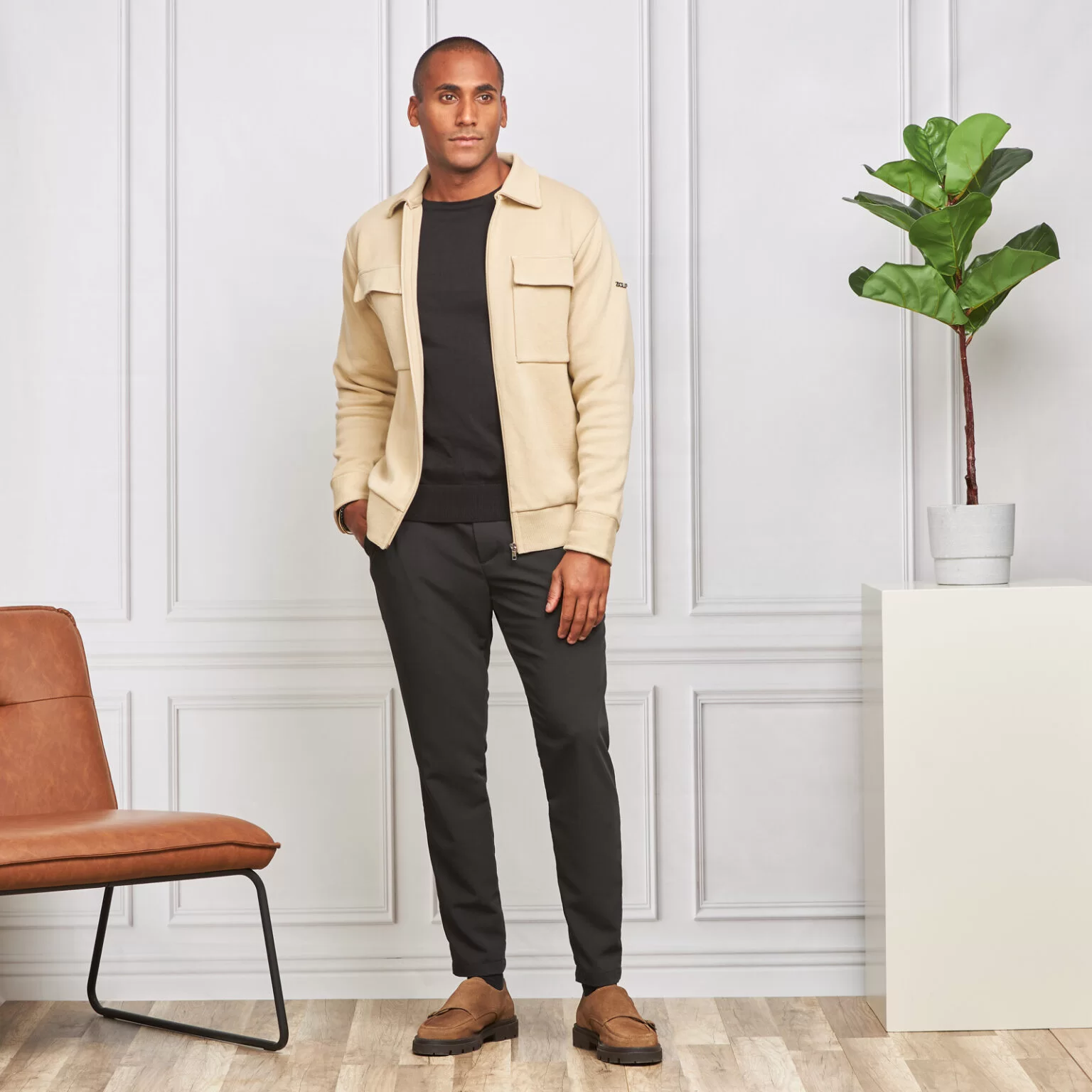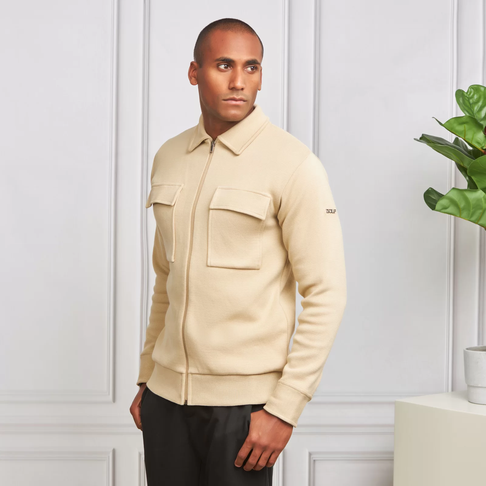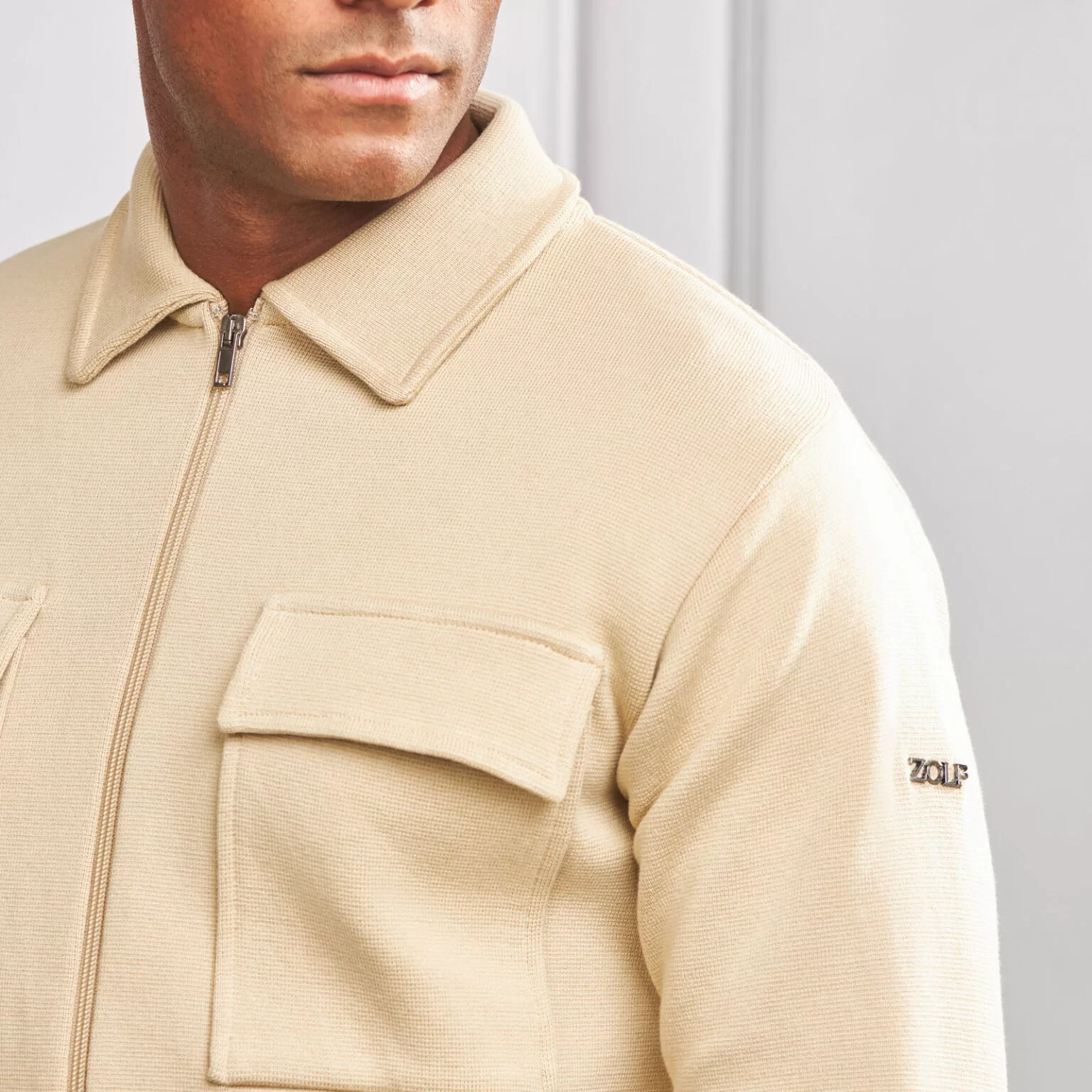 O design apresenta bolsos frontais aplicados, fecho em zip metálico e punhos com botão personalizado ZOLF, que reforçam o estilo moderno e cuidado da marca. A gola estruturada acrescenta um ar contemporâneo e versátil, perfeito para combinares com jeans ou calças chino.