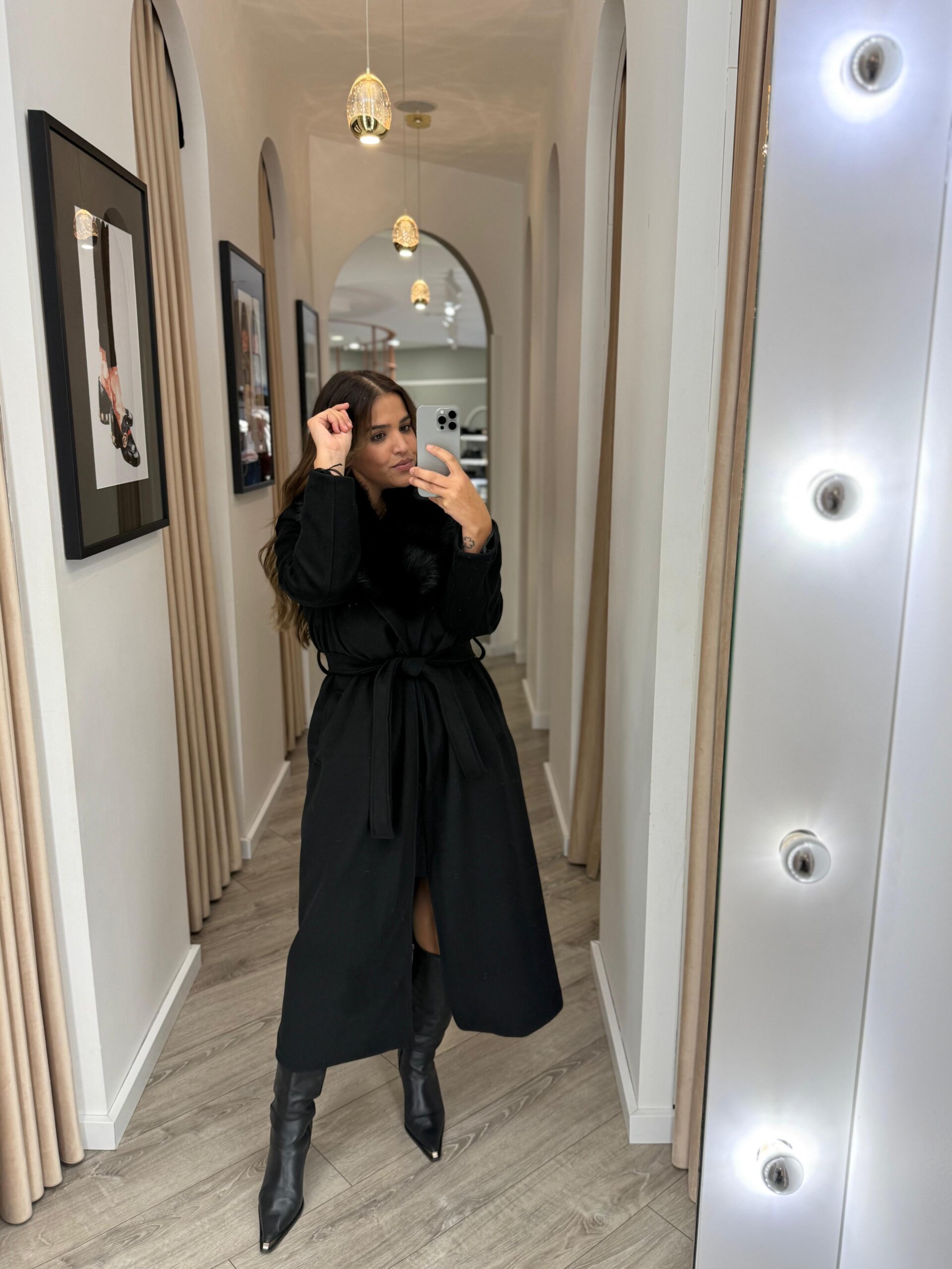 A gola em pelo sintético acrescentam sofisticação e contrastam com o corte minimalista do modelo. O cinto ajustável na cintura permite valorizar a silhueta de forma subtil e elegante.