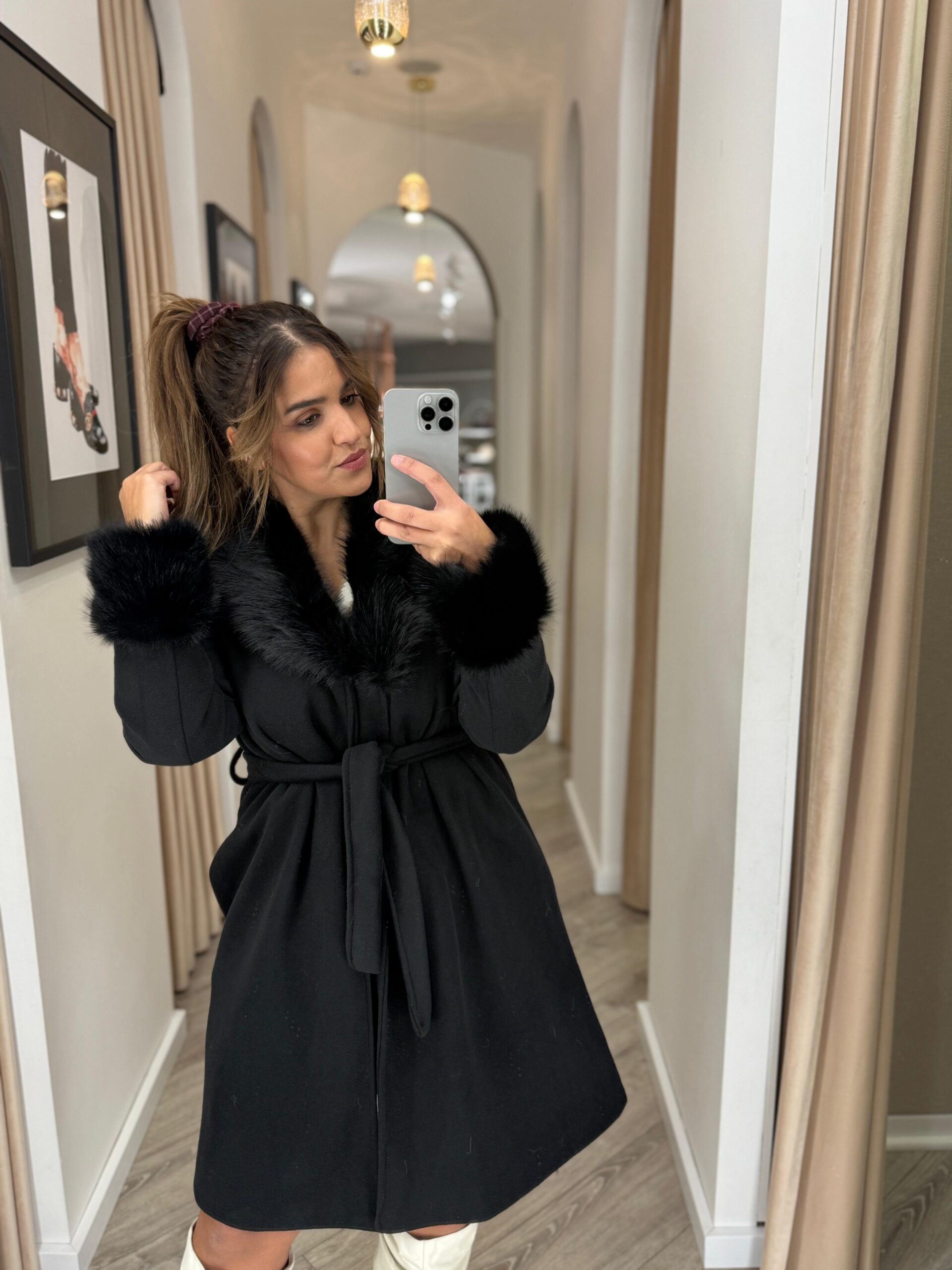 O design destaca-se pelo corte ligeiramente mais curto e pelos punhos adornados com pelo sintético, que acrescentam charme e requinte à peça. A gola ampla e o cinto do mesmo tecido permitem ajustar a silhueta, realçando a feminilidade com elegância discreta.