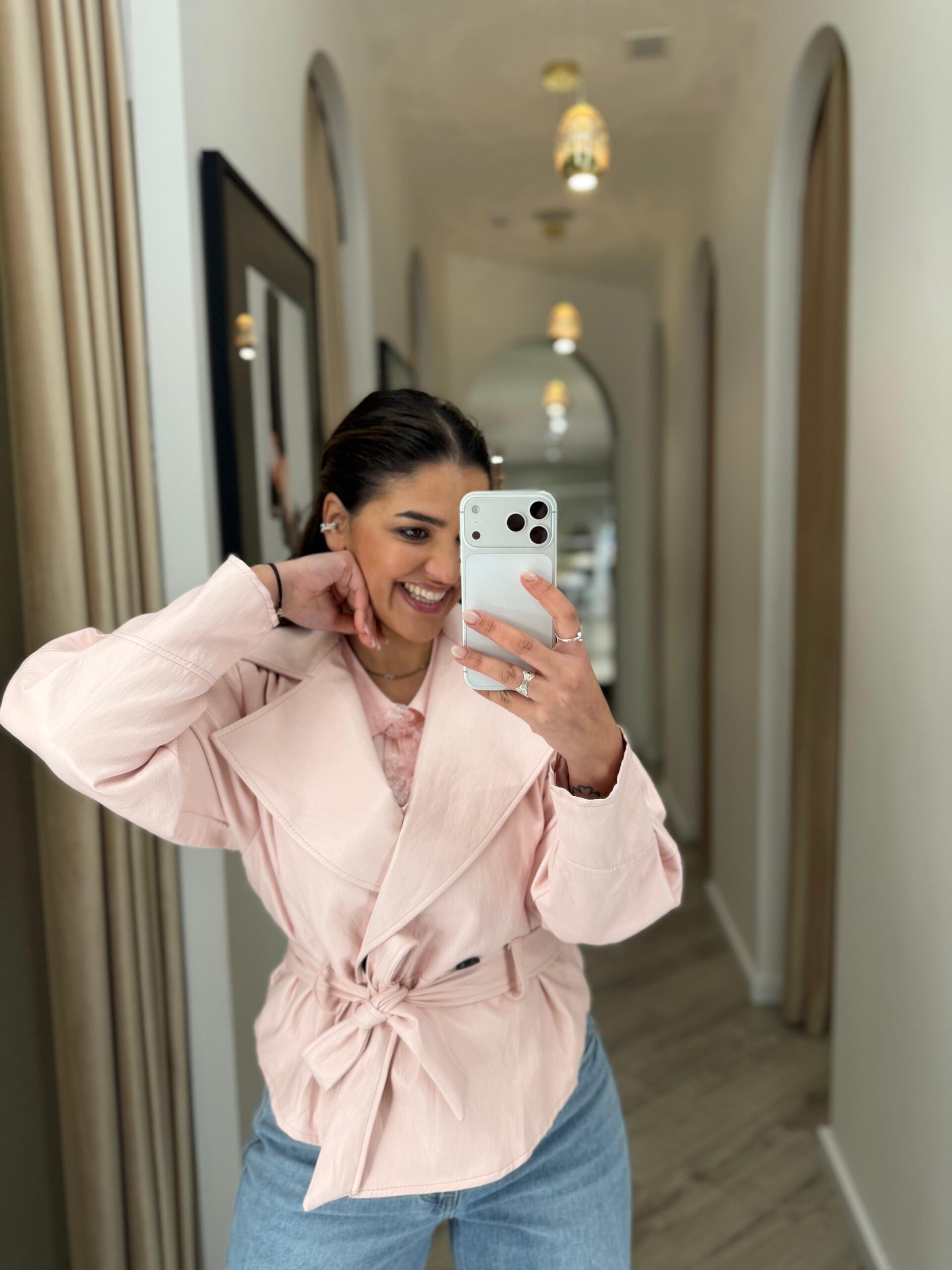 Um casaco em rosa bebé, suave e super feminino, perfeito para iluminar os teus looks de meia-estação com um toque delicado e elegante.