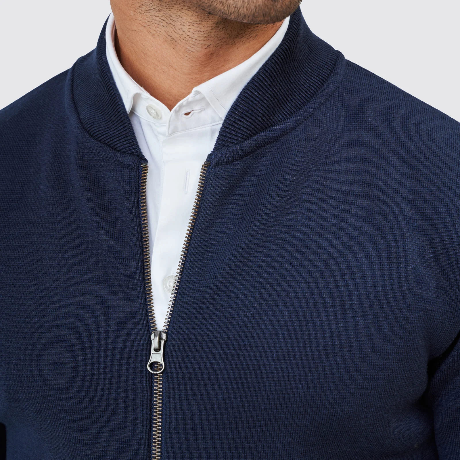 O fecho frontal em zip metálico destaca-se pelo acabamento cuidado, enquanto a gola e os punhos canelados mantêm a estrutura clássica do modelo bomber. A malha leve e compacta adapta-se facilmente a diferentes estações, tornando esta peça um essencial versátil no guarda-roupa masculino.