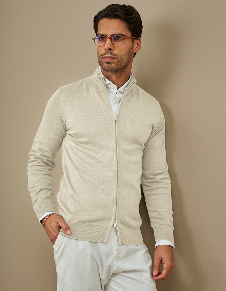 No tom cru, este casaco de tricô da Zolf traz luminosidade e um ar premium ao look, mantendo a praticidade do fecho de correr frontal. Os acabamentos canelados ajudam a definir a silhueta e dão-lhe aquele “acabamento” de peça bem-feita.
