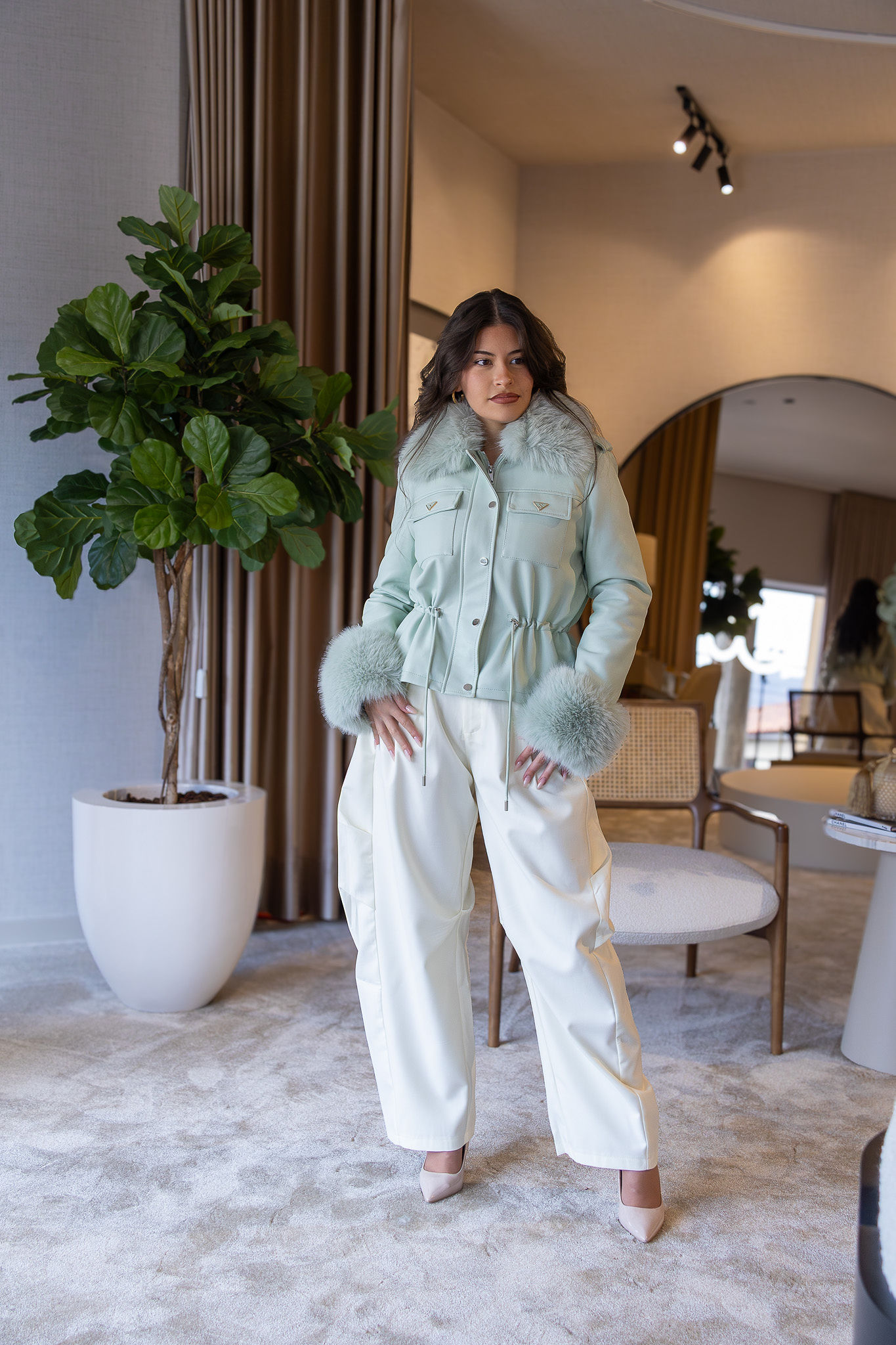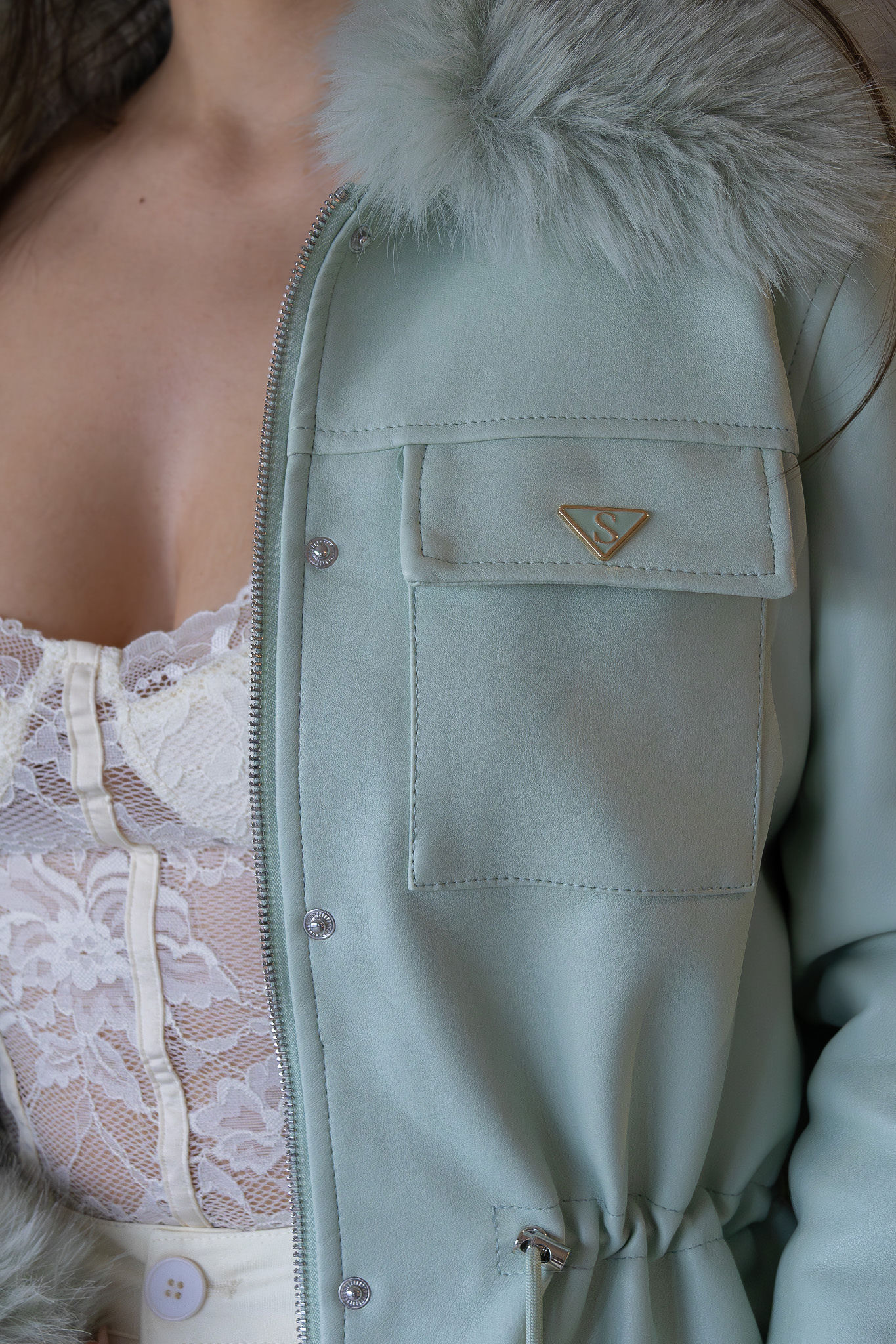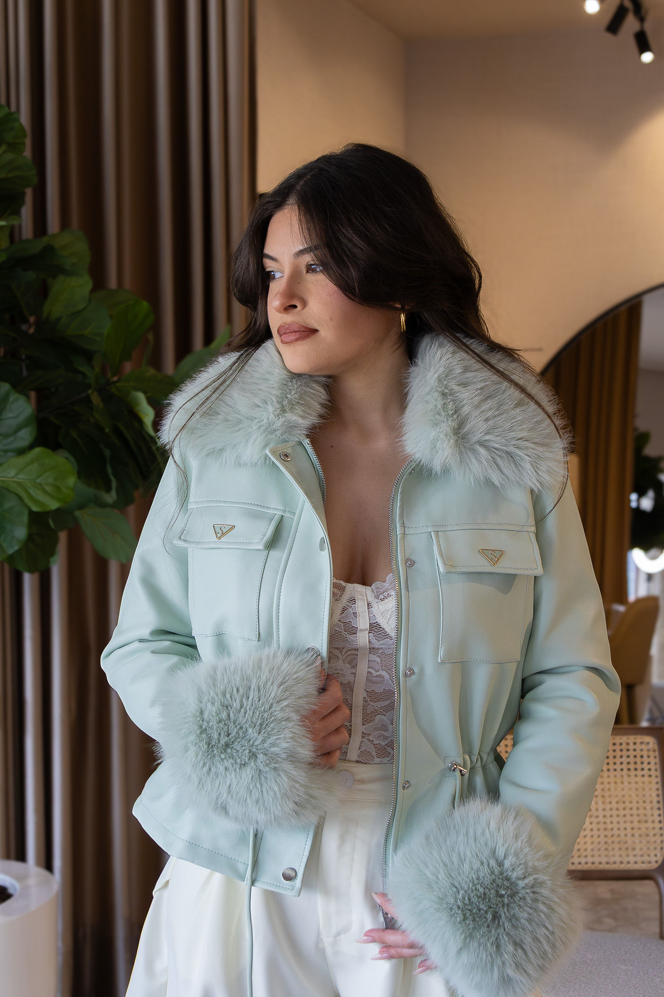 Casaco em tom verde água com acabamento premium em efeito pele, pensado para unir sofisticação, conforto térmico e versatilidade num design elegante e atual. O modelo distingue-se pela gola ampla e pelos aplicados na gola e nas mangas, totalmente removíveis, permitindo transformar o visual consoante o estilo, a estação ou a ocasião — desde uma estética mais glamorosa a uma versão mais clean e urbana.