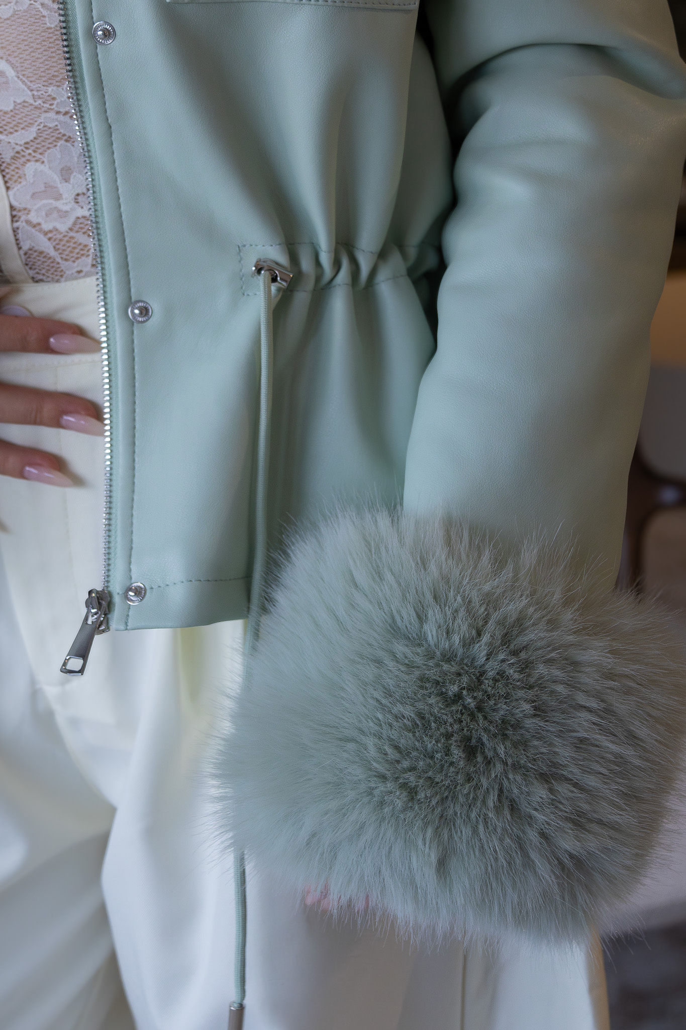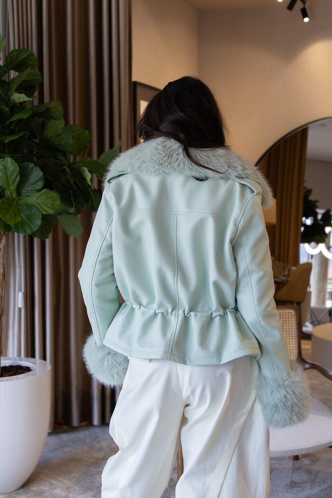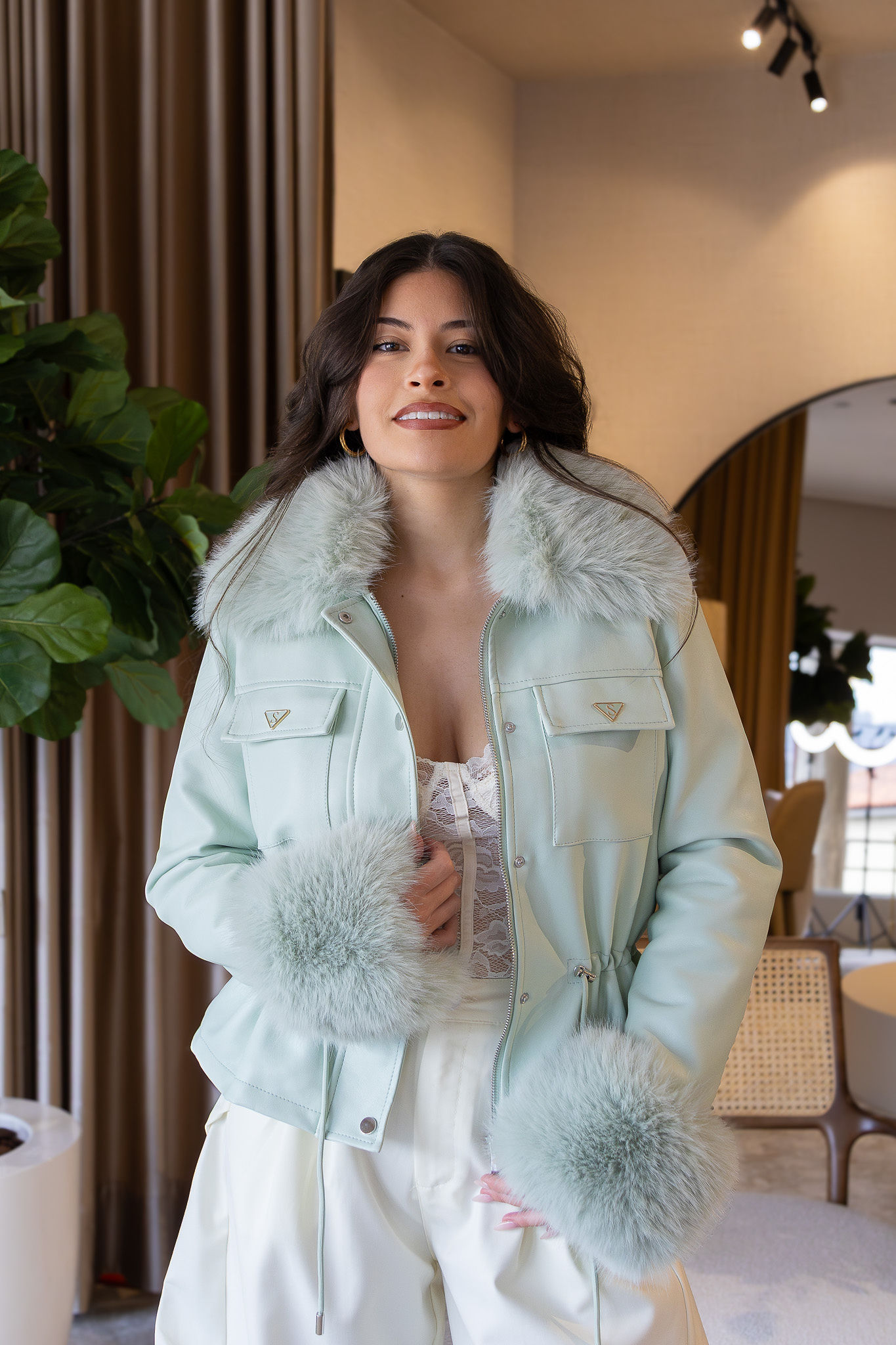 Casaco em tom verde água com acabamento premium em efeito pele, pensado para unir sofisticação, conforto térmico e versatilidade num design elegante e atual. O modelo distingue-se pela gola ampla e pelos aplicados na gola e nas mangas, totalmente removíveis, permitindo transformar o visual consoante o estilo, a estação ou a ocasião — desde uma estética mais glamorosa a uma versão mais clean e urbana.