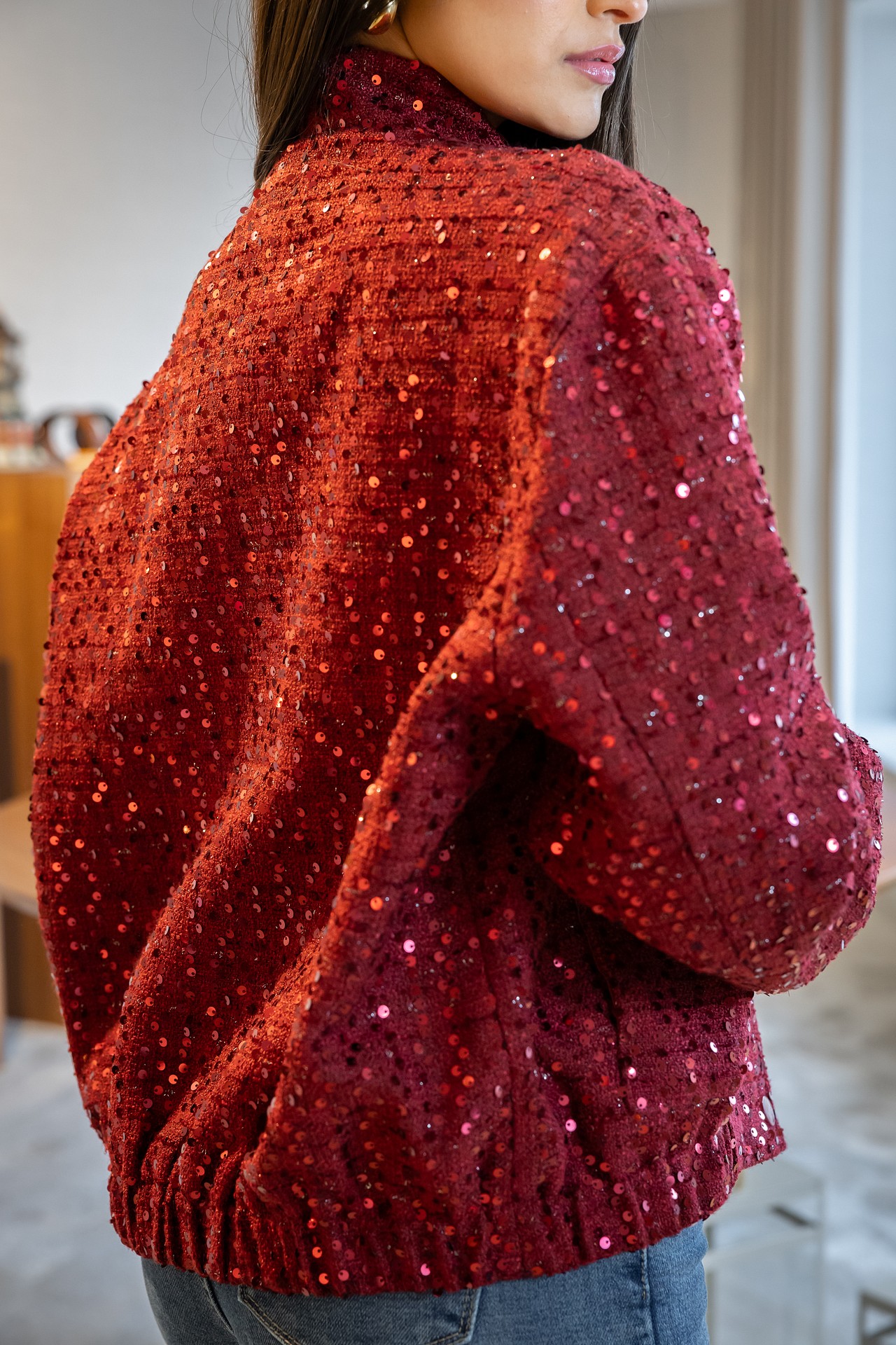 Ideal para usar sobre um look monocromático ou até com jeans, o casaco vermelho com lantejoulas é a escolha certa para dar vida e brilho ao teu guarda-roupa — uma criação exclusiva da Ponto Chic Collection que combina atitude, estilo e glamour.