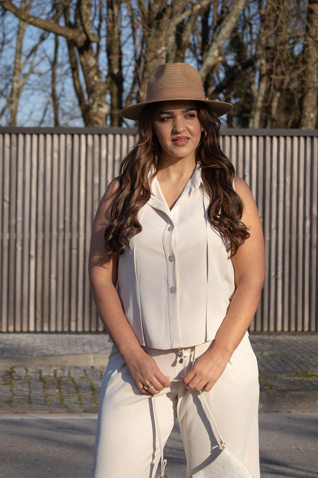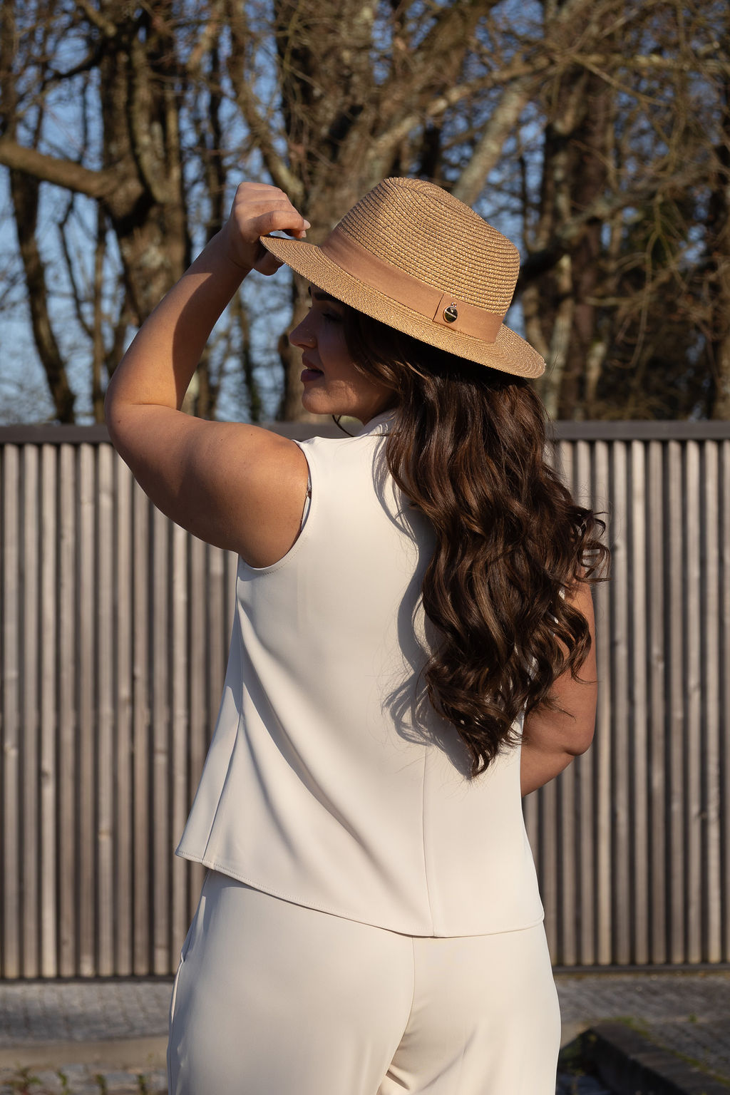 A aba média estruturada confere equilíbrio e presença ao look, enquanto a fita em tom camel acrescenta contraste e um acabamento cuidado. É o acessório perfeito para elevar coordenados leves, vestidos fluidos ou até propostas mais urbanas.