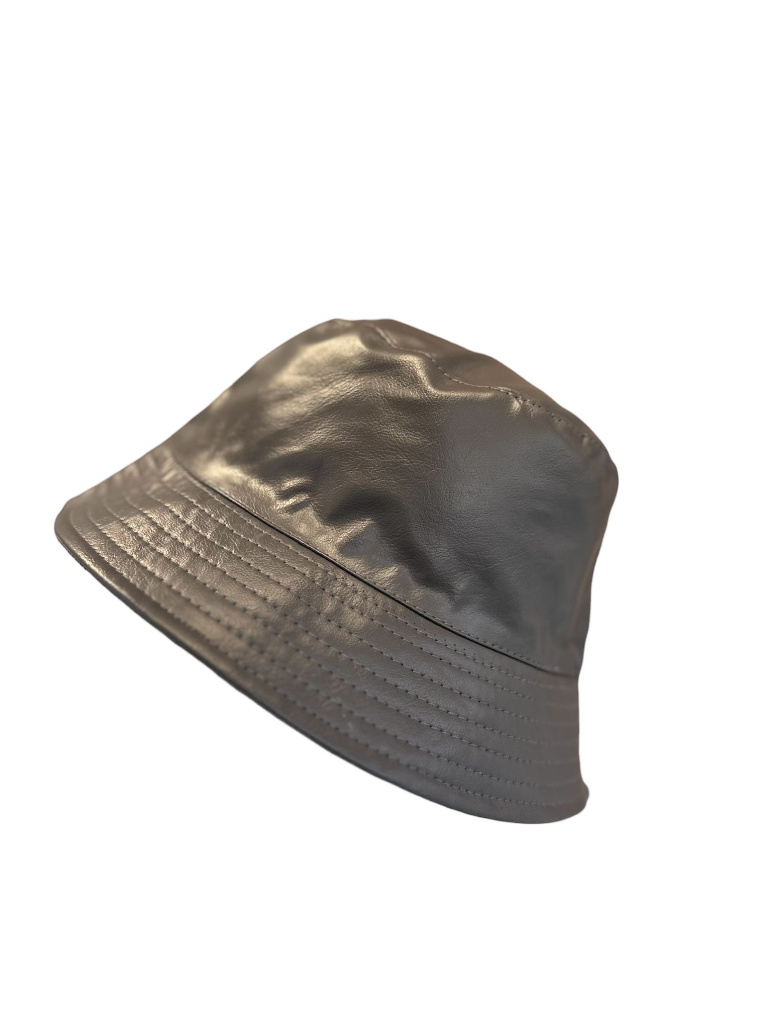 Chapéu modelo bucket em verde militar, com acabamento efeito pele na parte exterior, que lhe confere um visual moderno, urbano e cheio de personalidade. A aba larga com pespontos marcados reforça a estrutura e acrescenta um detalhe sofisticado ao design.