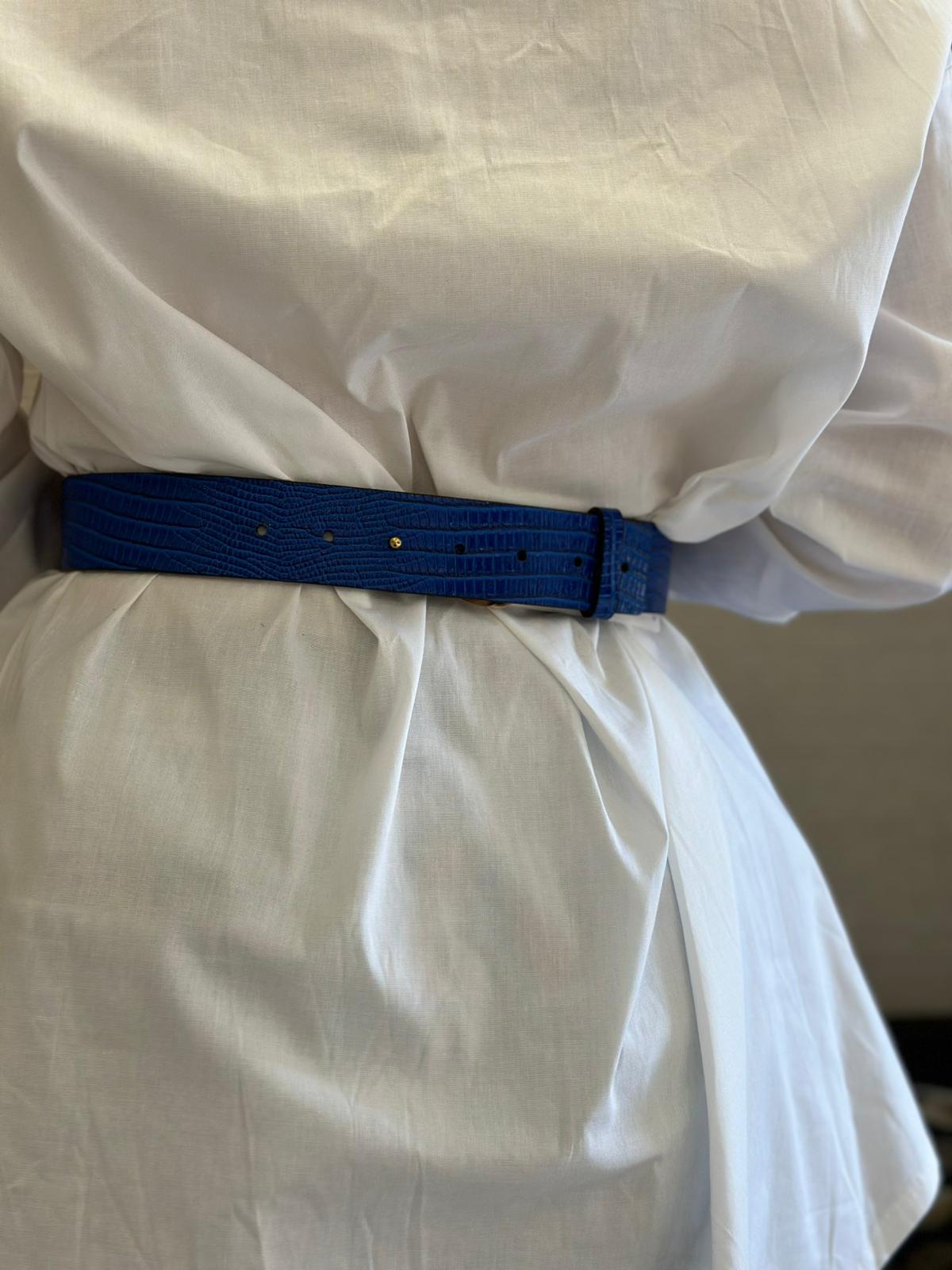 Com largura média e estrutura firme, o design foi pensado para valorizar a cintura e realçar qualquer coordenado, desde vestidos elegantes até calças de alfaiataria ou jeans de cintura subida. O tom azul vibrante confere um toque de cor audacioso, mantendo sempre uma estética luxuosa e contemporânea.