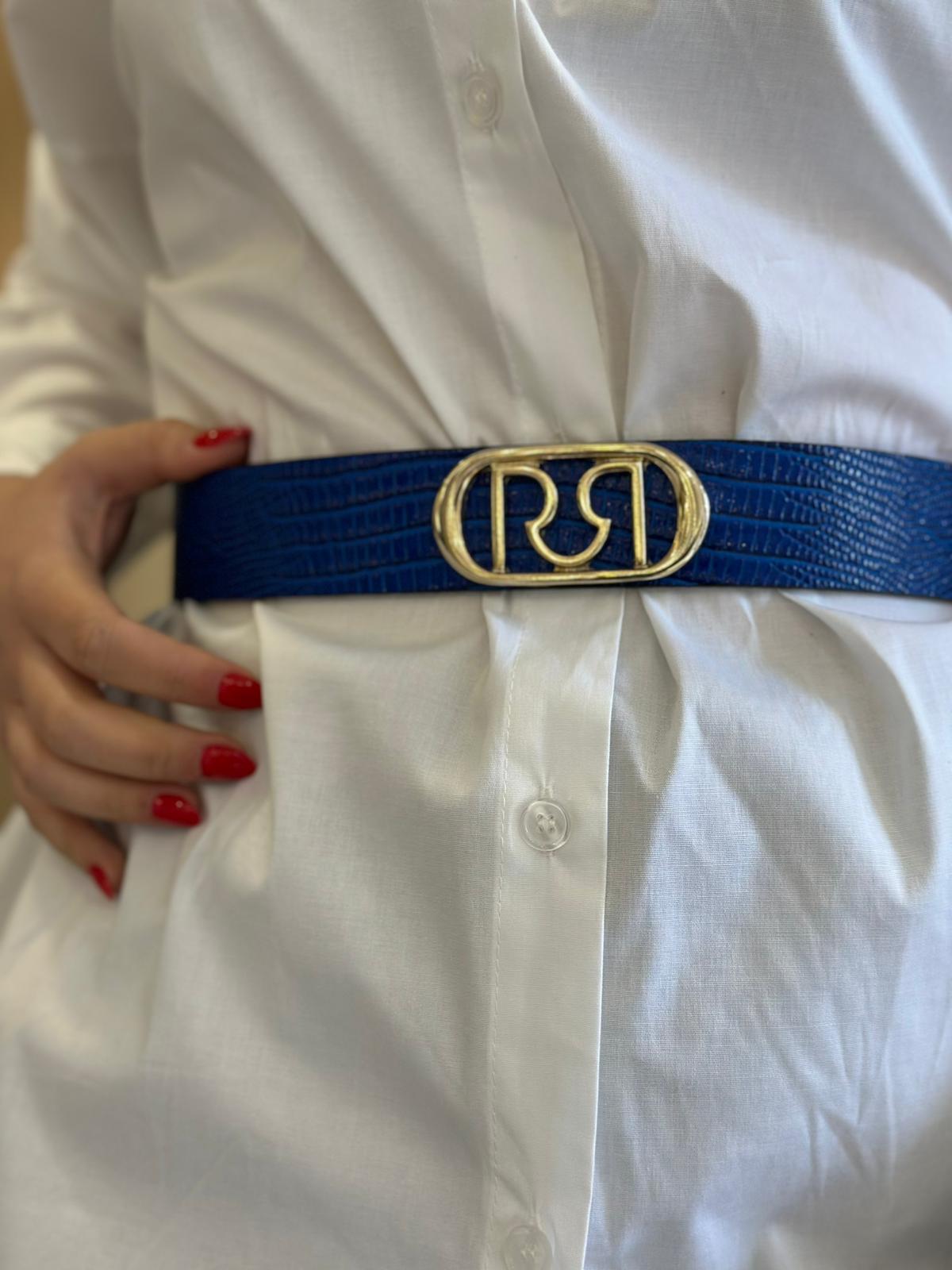 O cinto azul texturizado Rinascimento é uma peça que une sofisticação e ousadia em perfeita harmonia. Confeccionado em material de acabamento premium, apresenta textura tipo pele gravada que acrescenta profundidade e elegância ao visual. A fivela metálica dourada, com o logótipo “RR” em destaque, reforça a identidade refinada e moderna da marca.