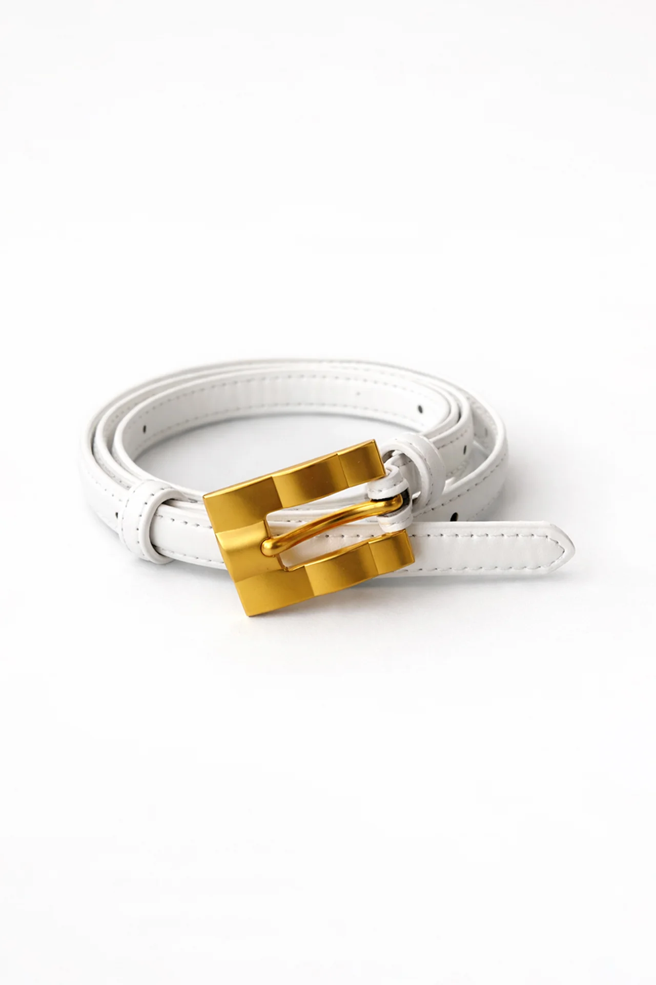 Cinto branco de estética clean e sofisticada, perfeito para dar um toque de contraste elegante aos teus looks. O destaque vai para a fivela dourada de design moderno, que acrescenta personalidade e um acabamento premium à peça.