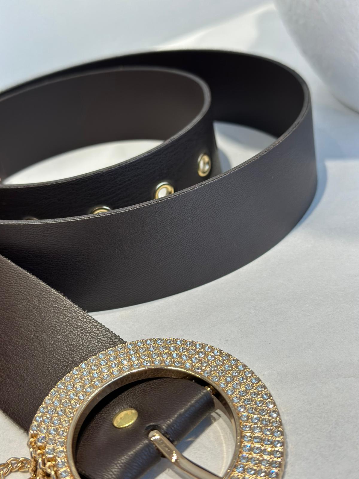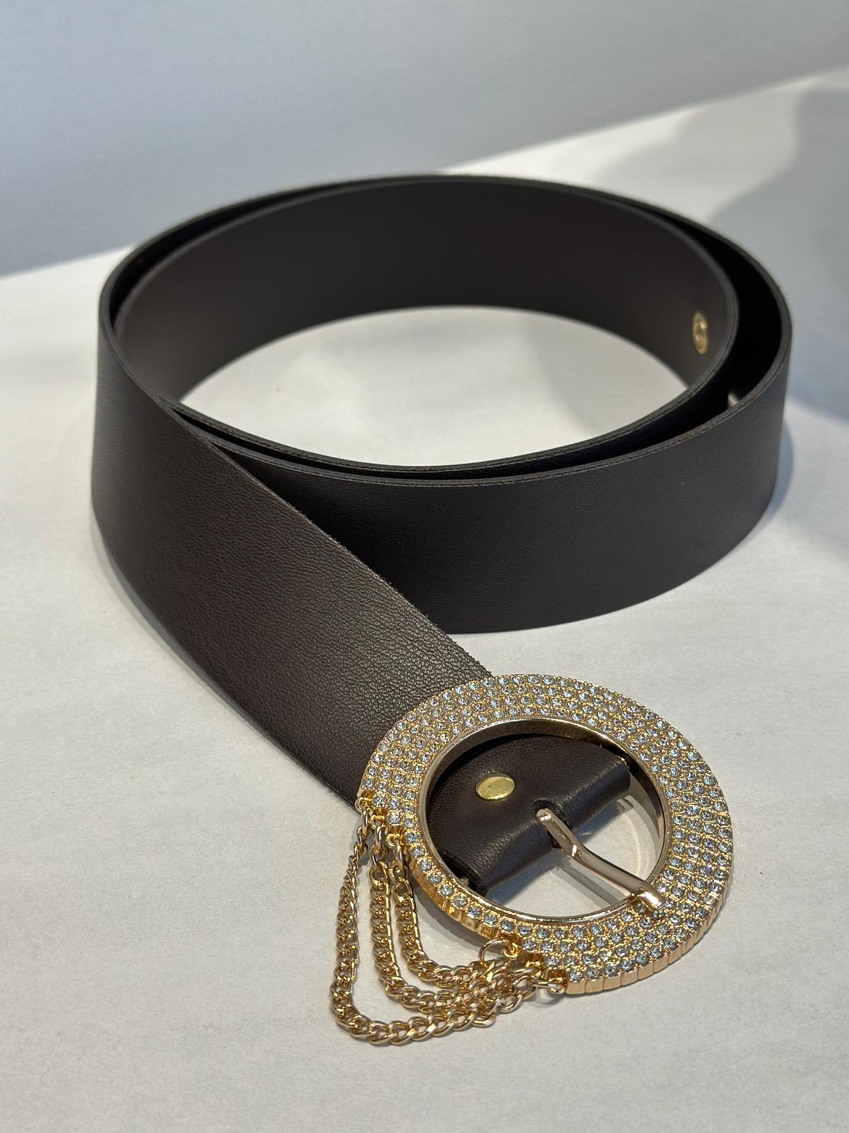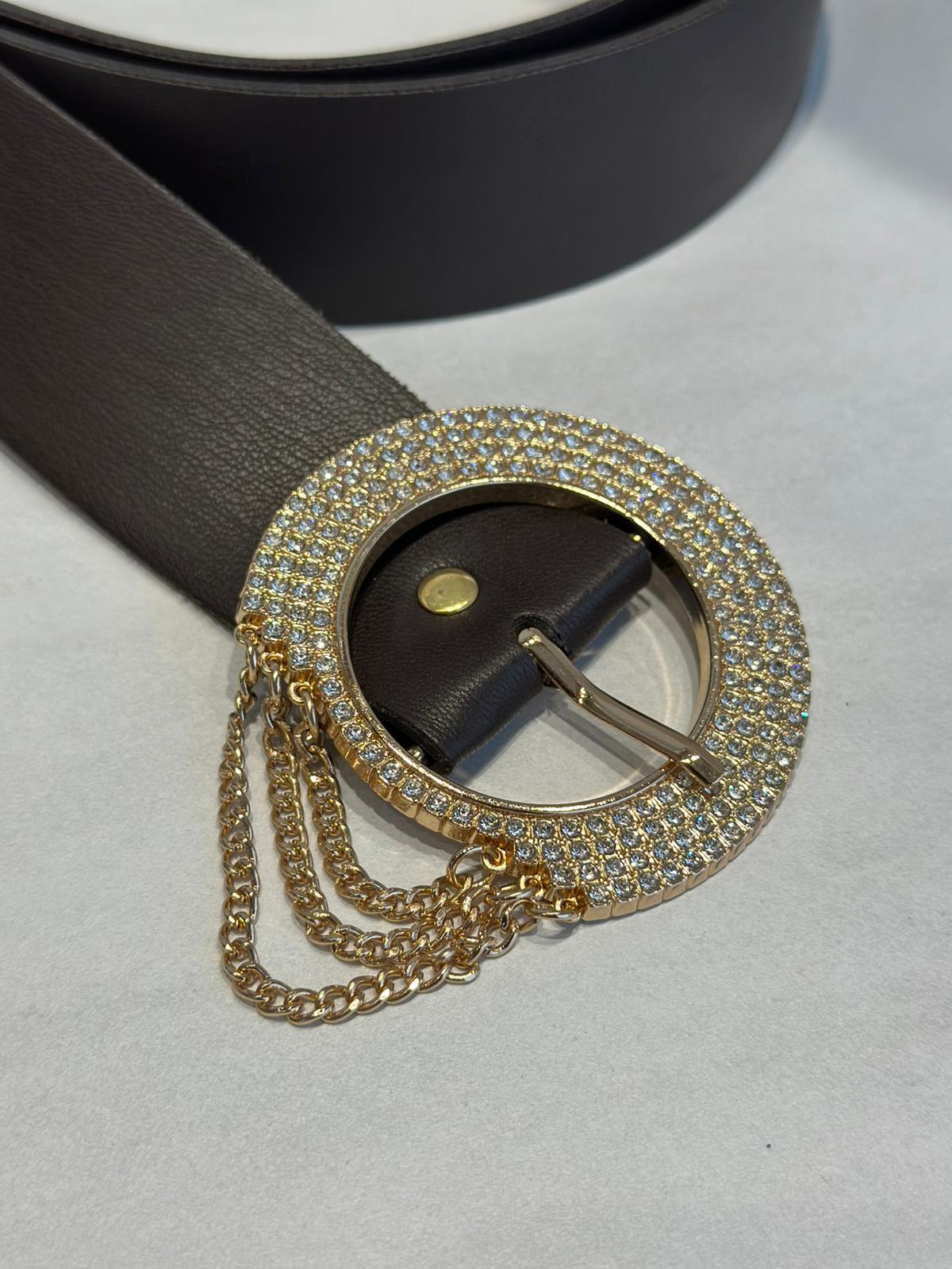 A fivela redonda dourada, cravejada de cristais e decorada com correntes finas, confere-lhe um charme sofisticado e feminino, ideal para destacar a cintura e valorizar qualquer conjunto.