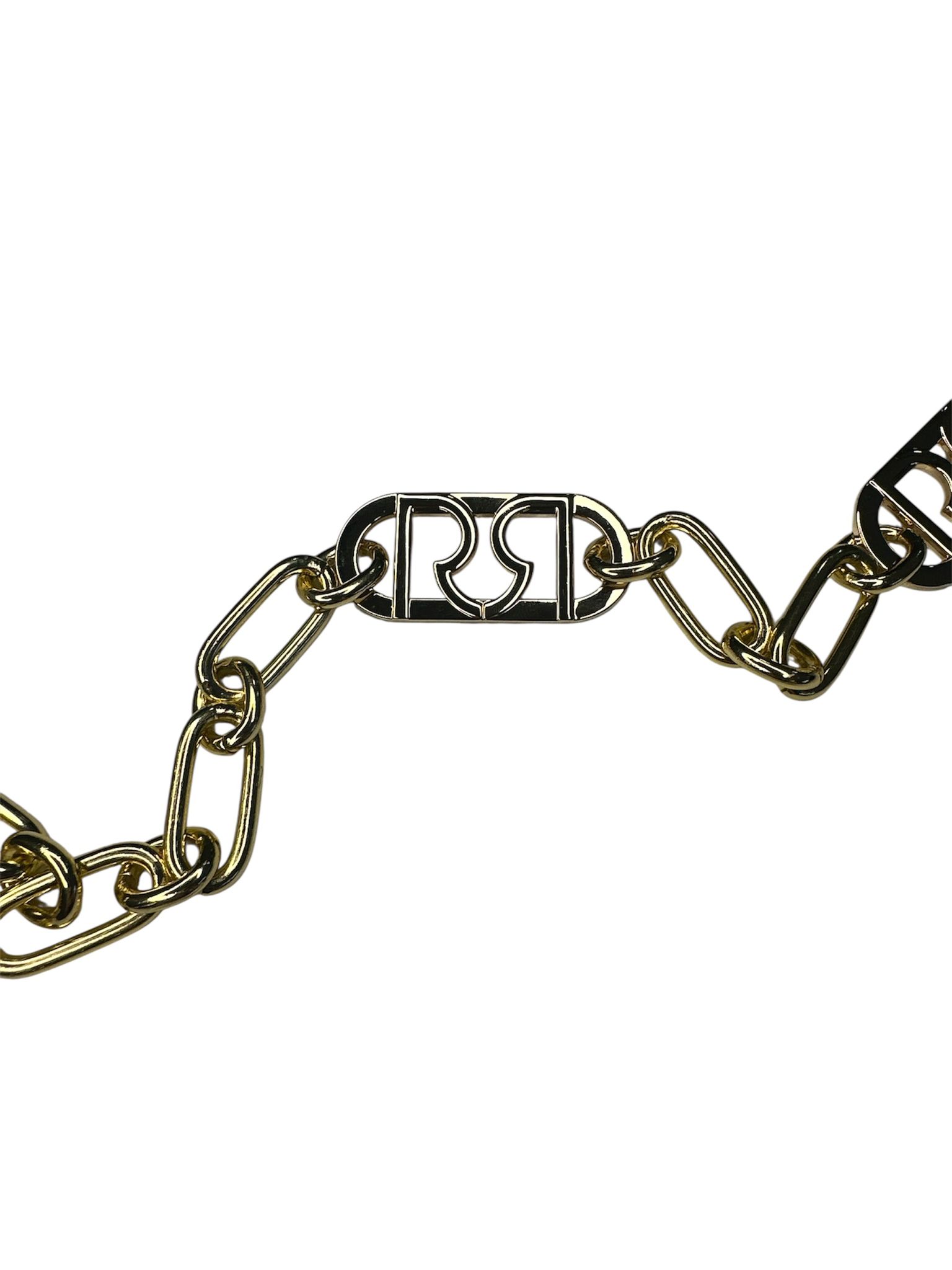 Cinto de elos metálicos da Rinascimento, uma peça statement que combina elegância contemporânea com um design marcante. Confeccionado em metal com acabamento dourado, apresenta uma corrente de elos largos e alongados, intercalados com placas metálicas polidas com o logótipo da marca, criando um efeito visual sofisticado e distintivo.