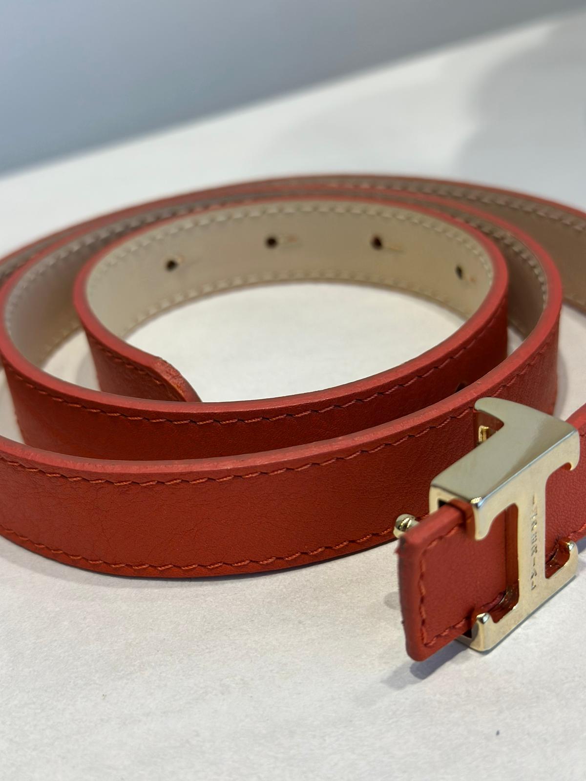 Com design fino e estrutura elegante, adapta-se facilmente a diferentes estilos e peças — desde calças de alfaiataria a vestidos ou saias de cintura subida. O tom laranja vibrante confere energia e modernidade ao visual, tornando este cinto um destaque versátil e cheio de personalidade.
