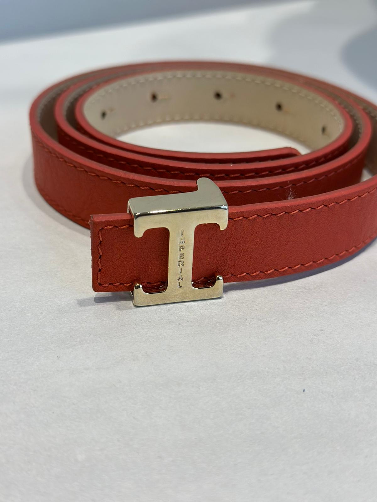 O cinto laranja Imperial é um acessório sofisticado que alia cor e elegância em perfeita harmonia. Confeccionado em material de acabamento premium, apresenta uma fivela metálica dourada em formato “I”, símbolo distintivo da marca e detalhe que acrescenta um toque de luxo discreto.