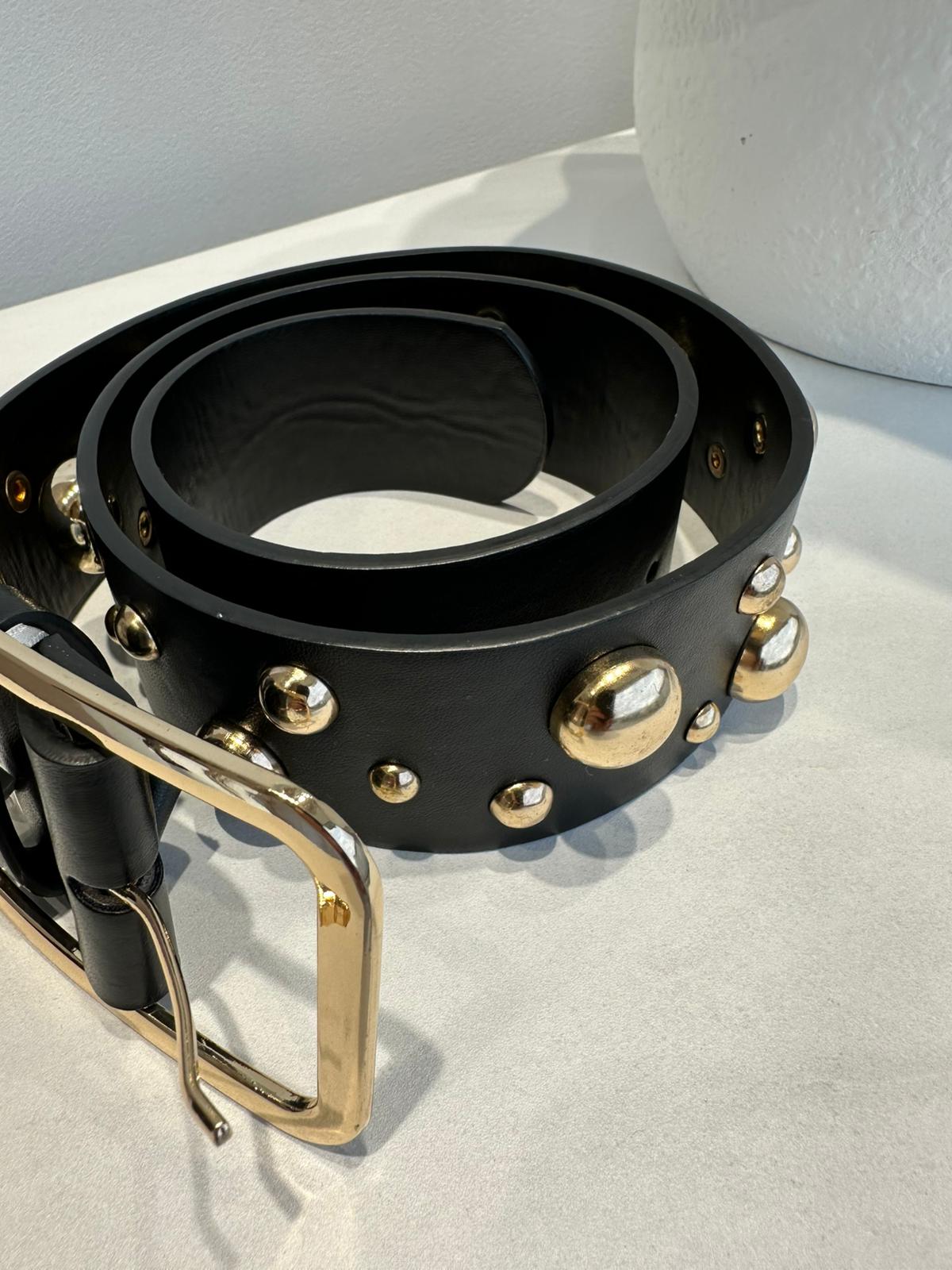 Este cinto Rinascimento em tom preto destaca-se pelo seu design marcante e sofisticado, ideal para dar força e personalidade a qualquer look. O acabamento liso e estruturado confere-lhe um aspeto elegante, enquanto as aplicações metálicas douradas criam um contraste moderno e cheio de impacto.
