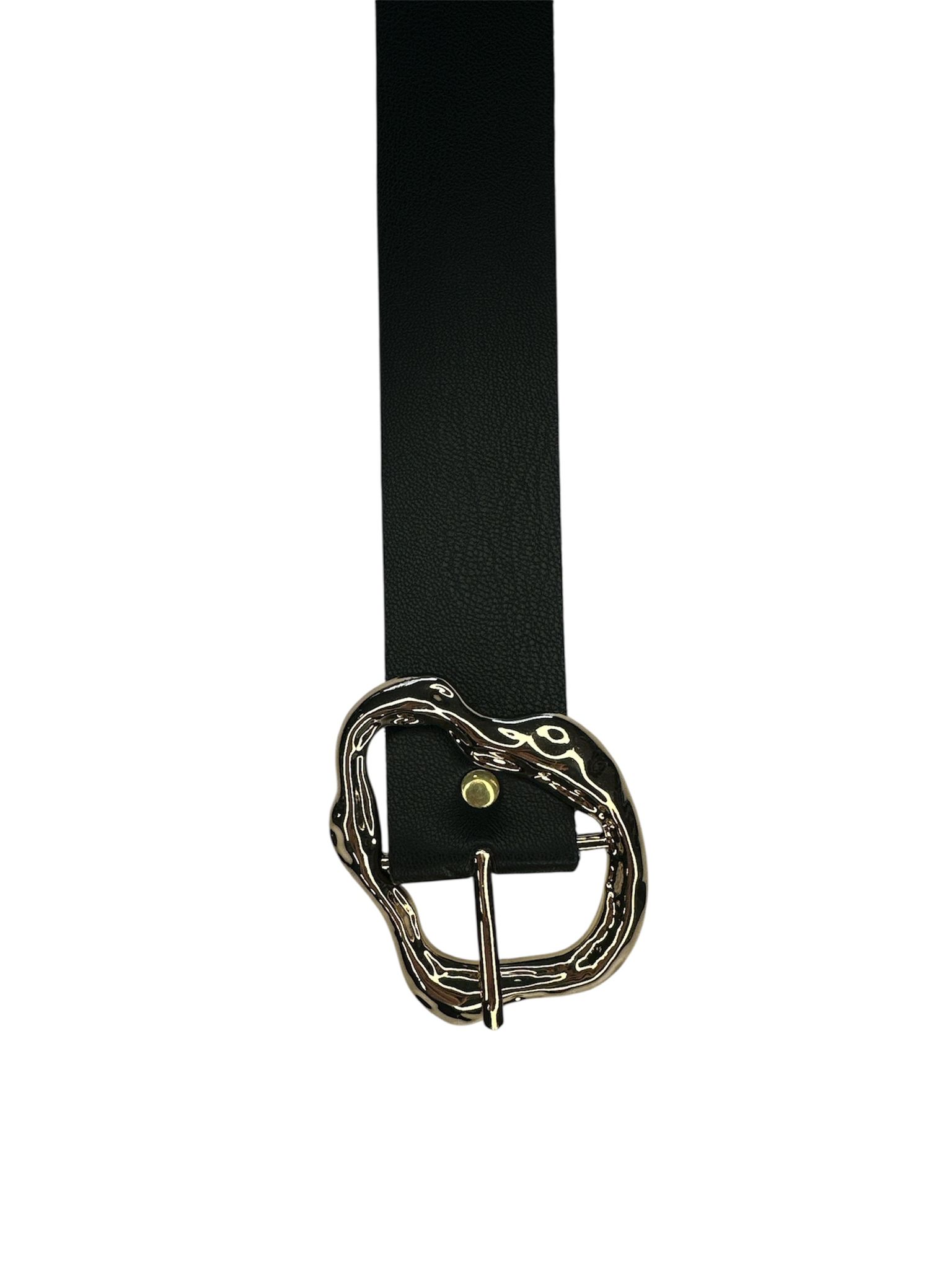 O cinto preto com fivela dourada orgânica é um clássico versátil que eleva qualquer look. O tom preto garante elegância intemporal e fácil combinação, enquanto a fivela em dourado, com design fluido e sofisticado, cria um detalhe marcante que faz toda a diferença.