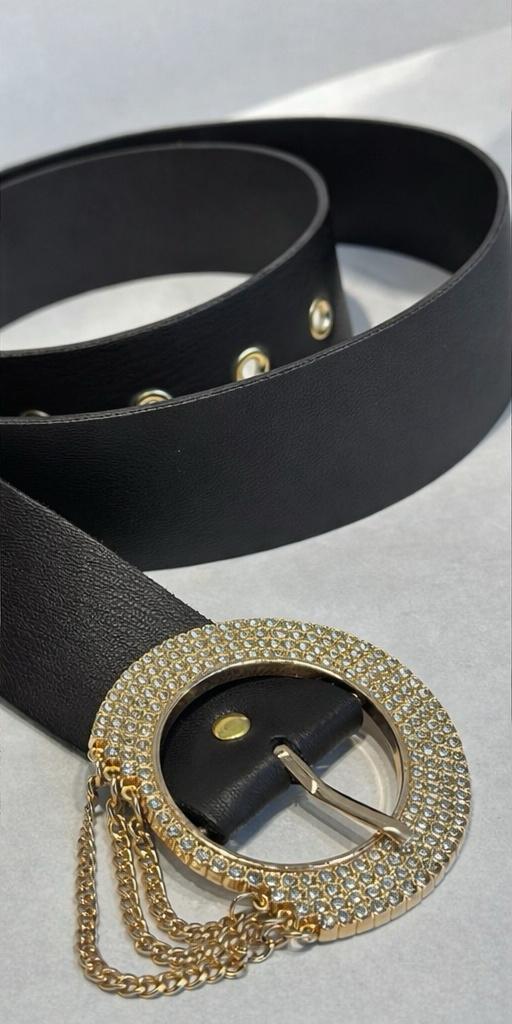 O destaque fica por conta da fivela redonda dourada cravejada de cristais, adornada com pequenas correntes decorativas que acrescentam movimento e brilho. Uma peça que alia modernidade e requinte, perfeita para marcar a cintura em vestidos, blazers ou calças de cintura subida.