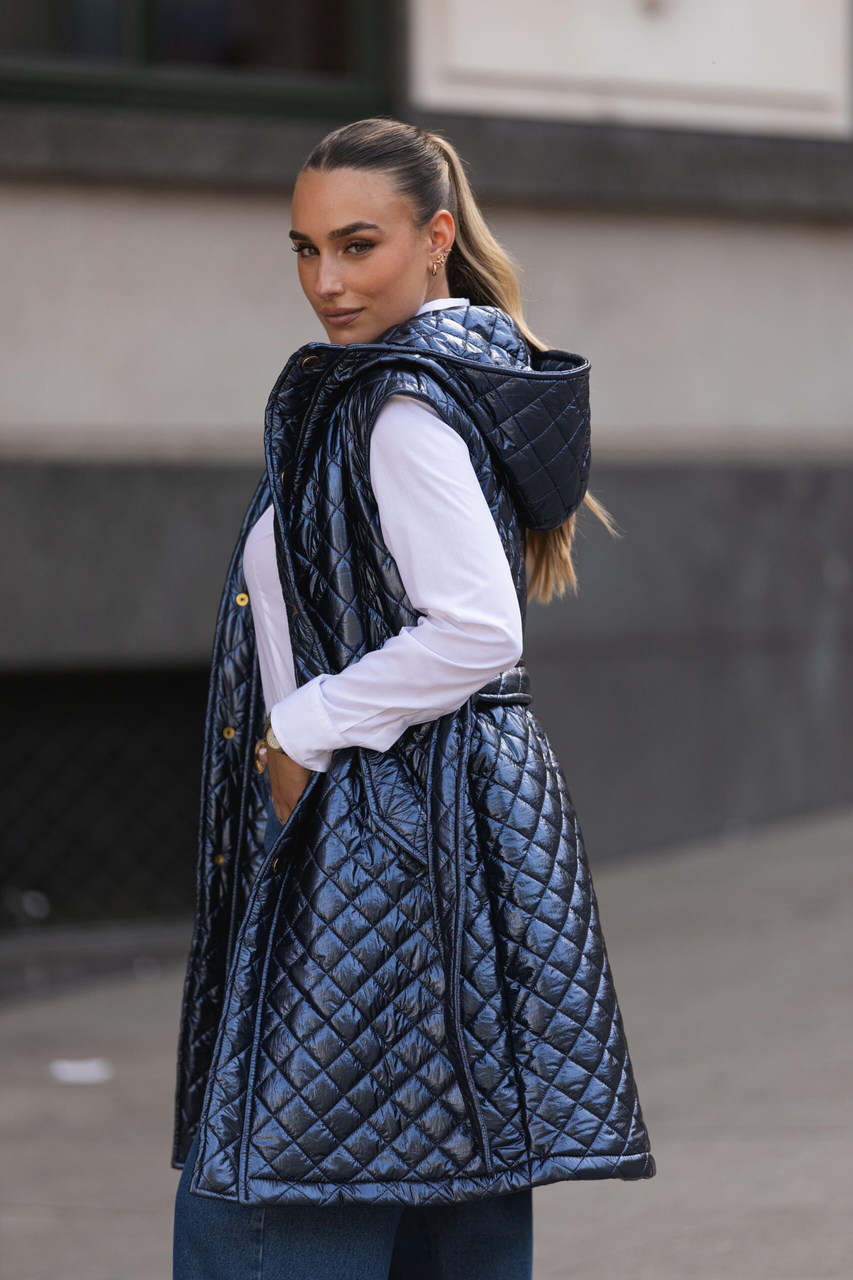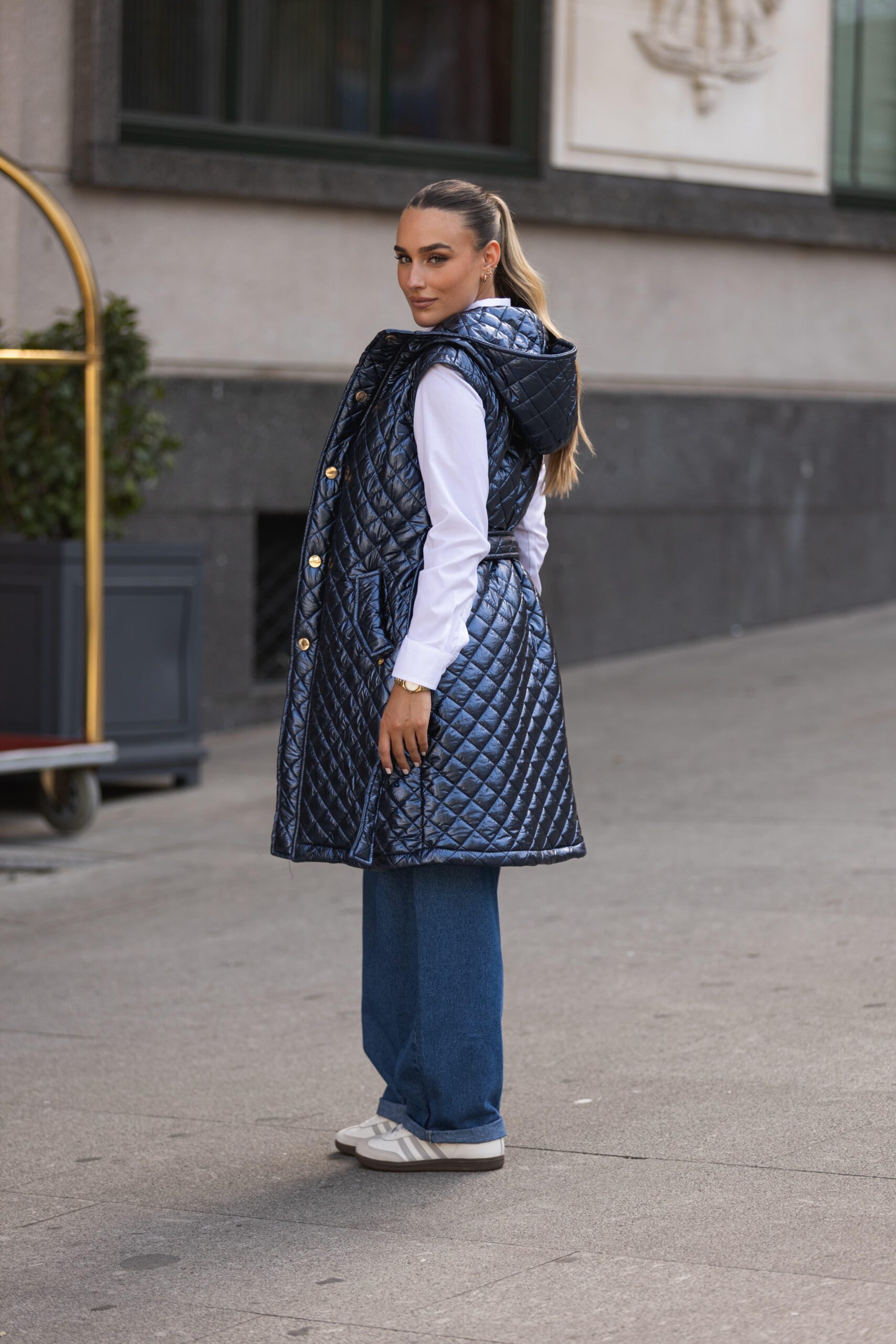 Com design comprido, destaca-se pelo padrão acolchoado em losangos, capuz prático e fecho com botões metálicos. Os bolsos laterais e o cinto ajustável na cintura conferem versatilidade e conforto, permitindo criar diferentes silhuetas consoante o look.