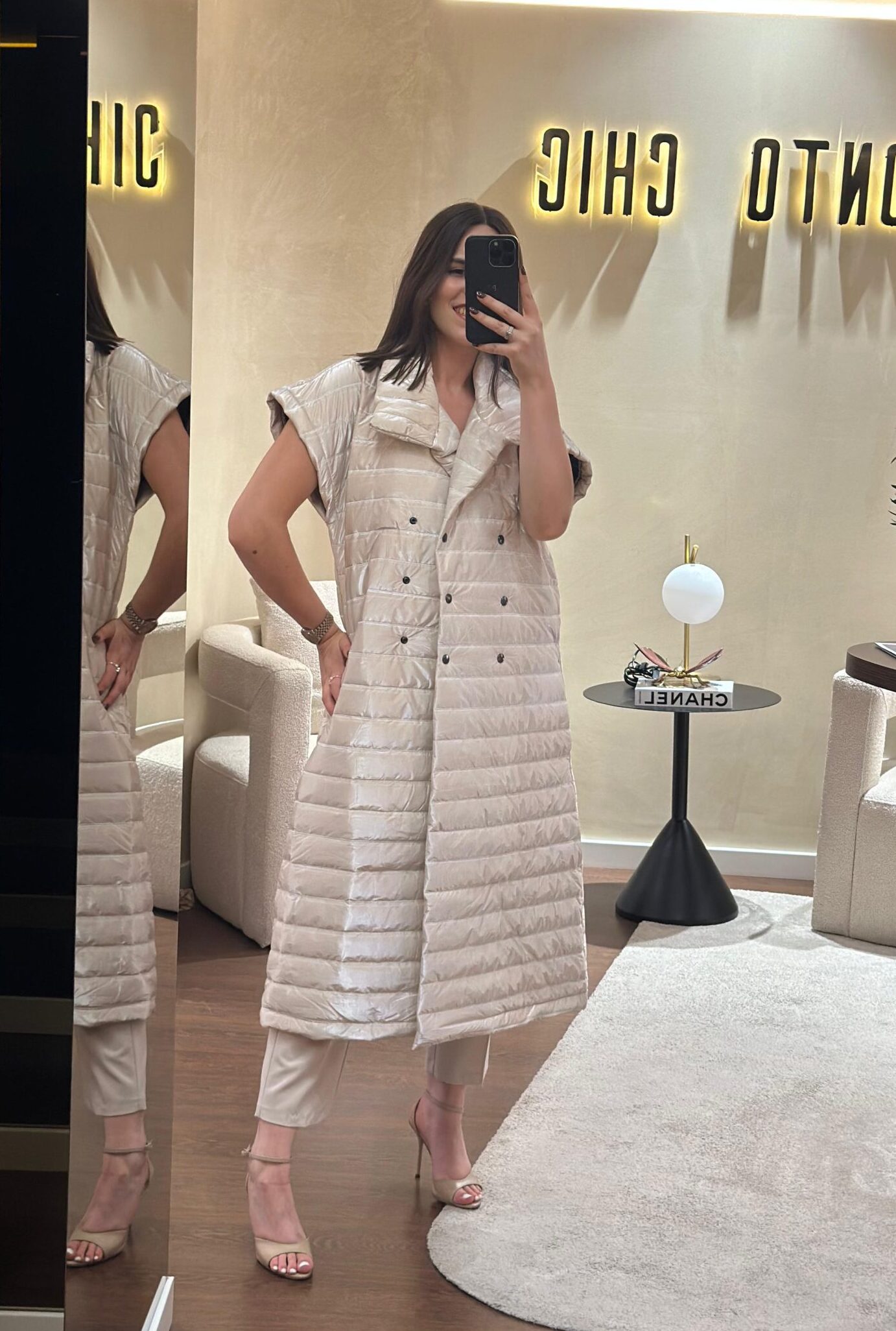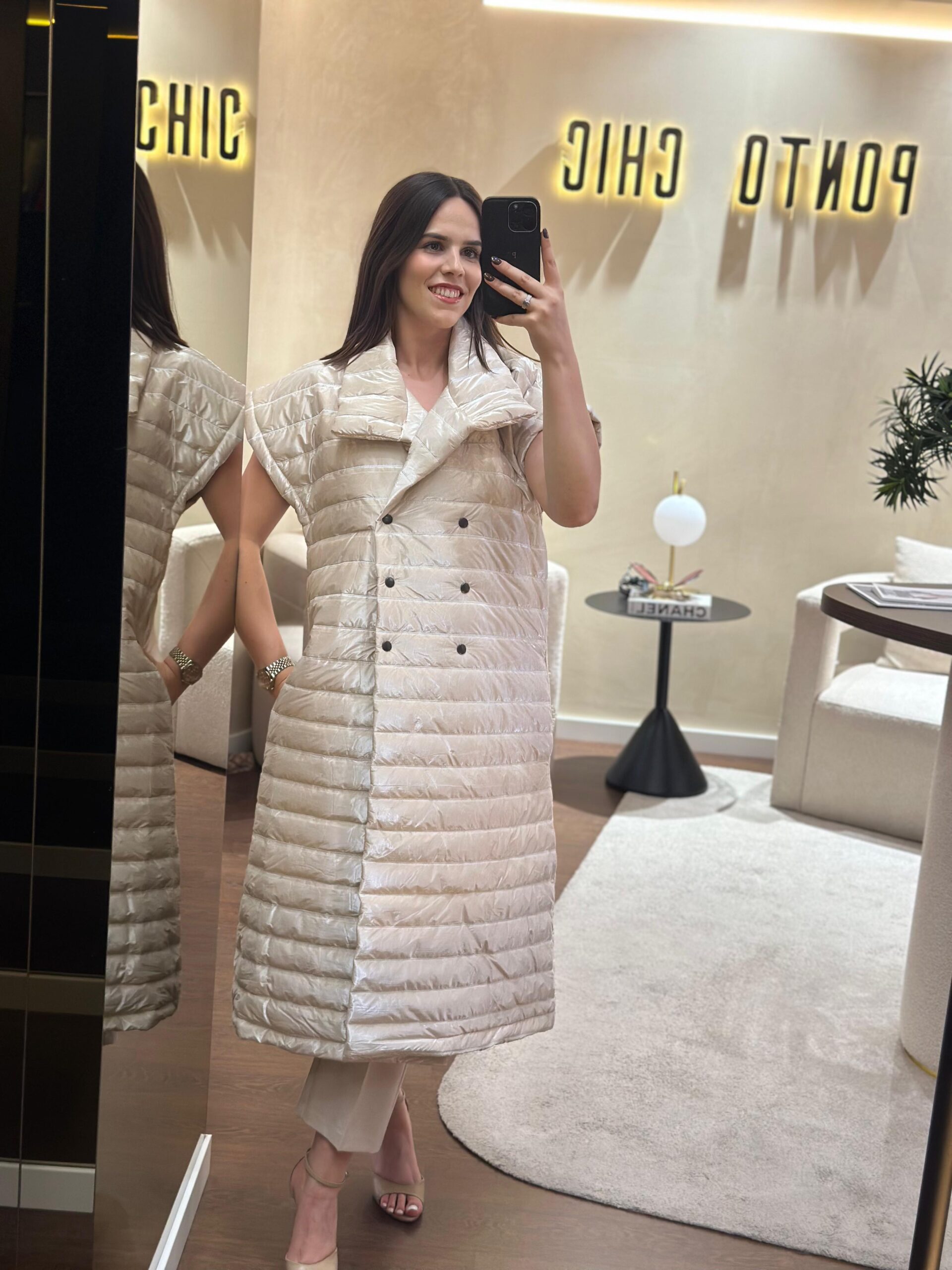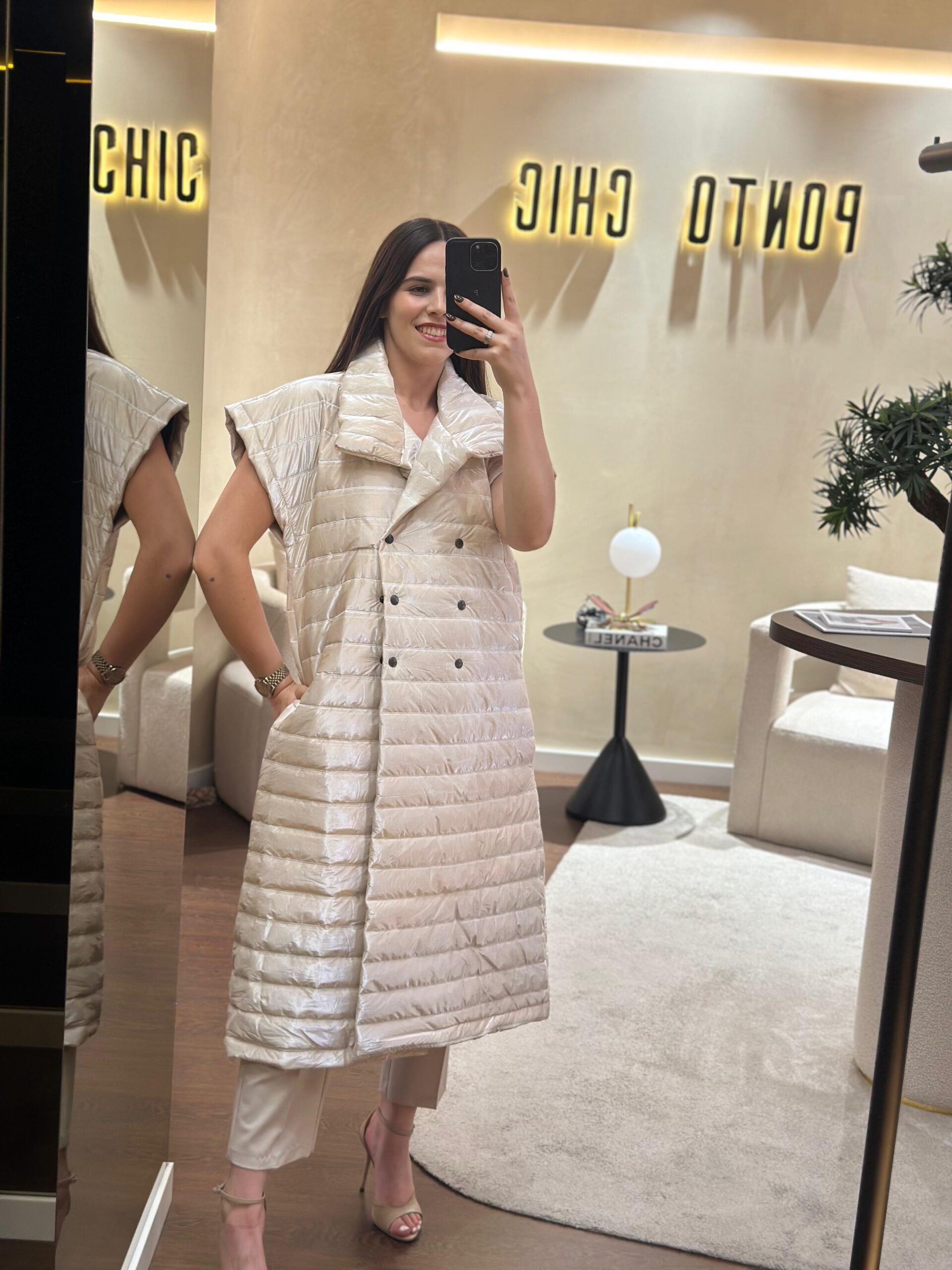 Colete possui um design acolchoado com acabamento brilhante e são estilosos para um visual moderno e sofisticado. Modelo em tom prateado , oferecendo um contraste marcante e mais arrojado. Apresentam botões frontais e uma gola alta, proporcionando estilo e proteção contra o frio.