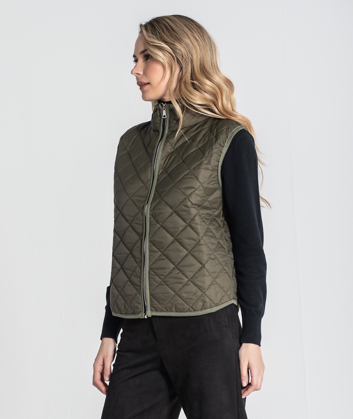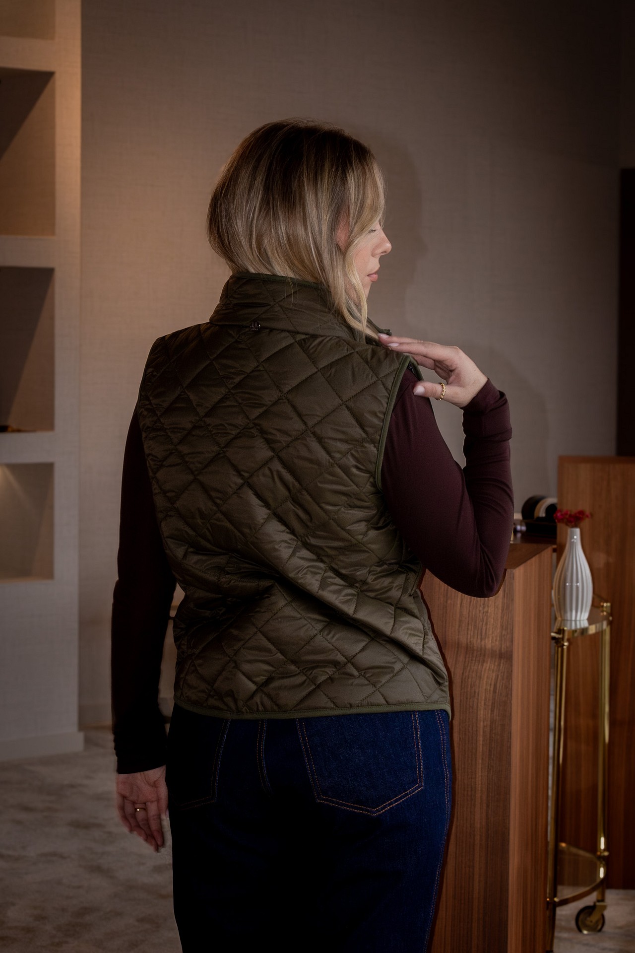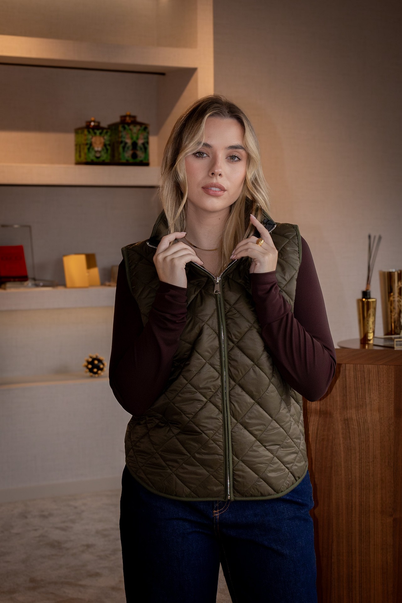 Apresenta design matelassé em padrão geométrico e interior forrado com estampa exclusiva da marca, que confere um detalhe sofisticado e distinto. O tom verde-tropa reforça a versatilidade da peça, facilmente conjugável com malhas, camisas ou camisolas.