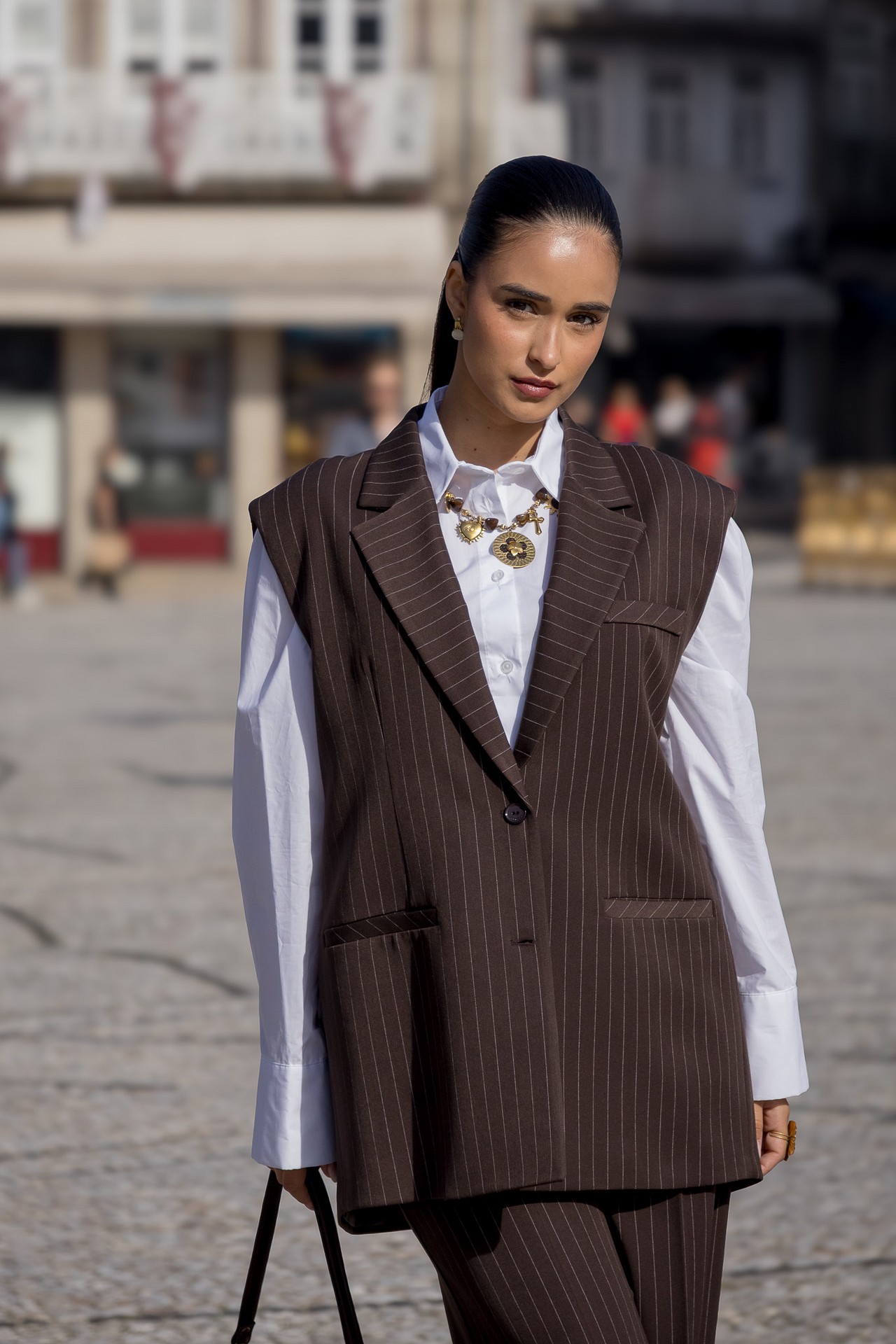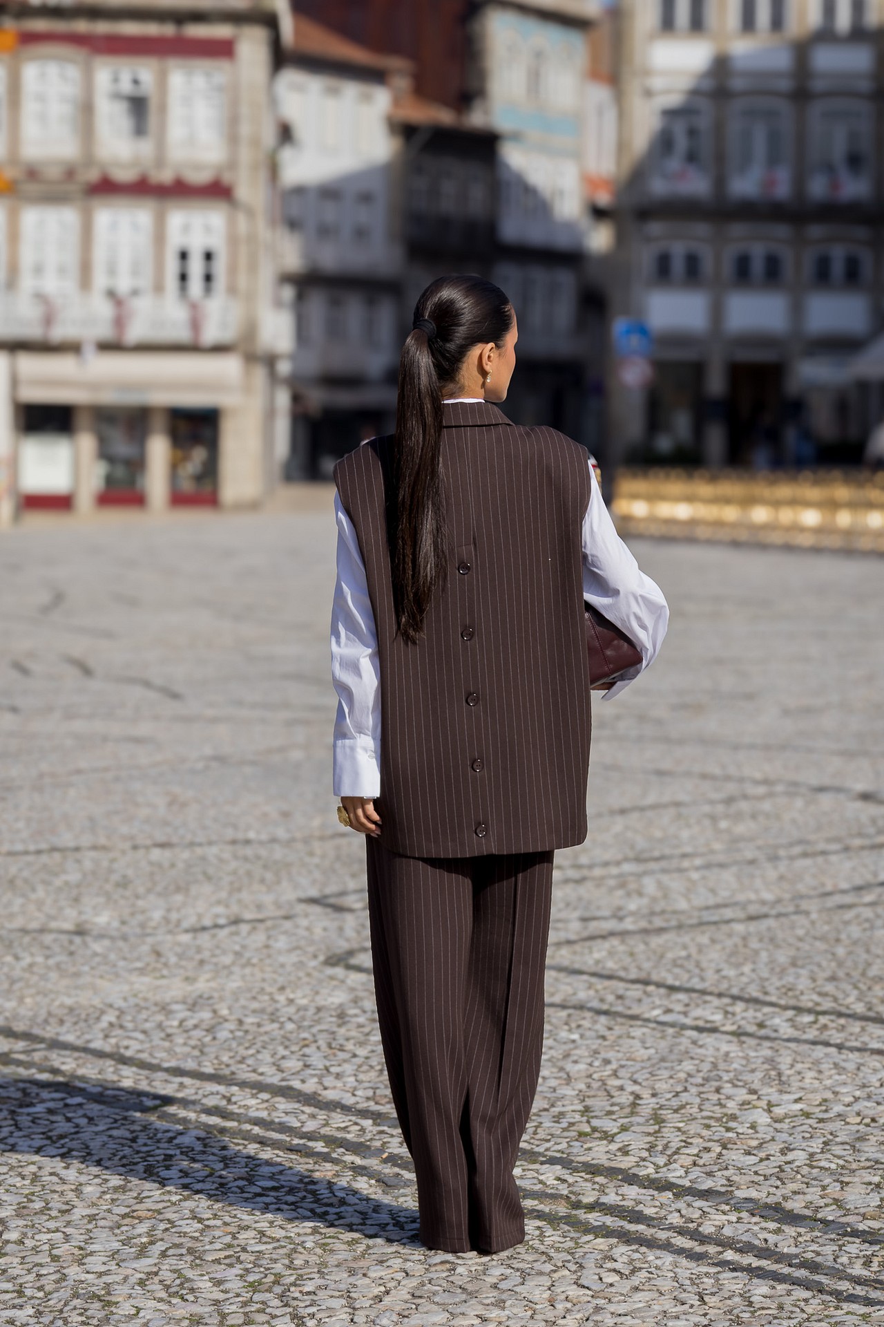 A combinação entre sofisticação e contemporaneidade faz deste colete com risca Imperial uma aposta certeira para o guarda-roupa moderno. Usa-o em conjunto com as calças da mesma linha para um look de alfaiataria completo, ou sobre uma camisa branca para um contraste leve e sofisticado.