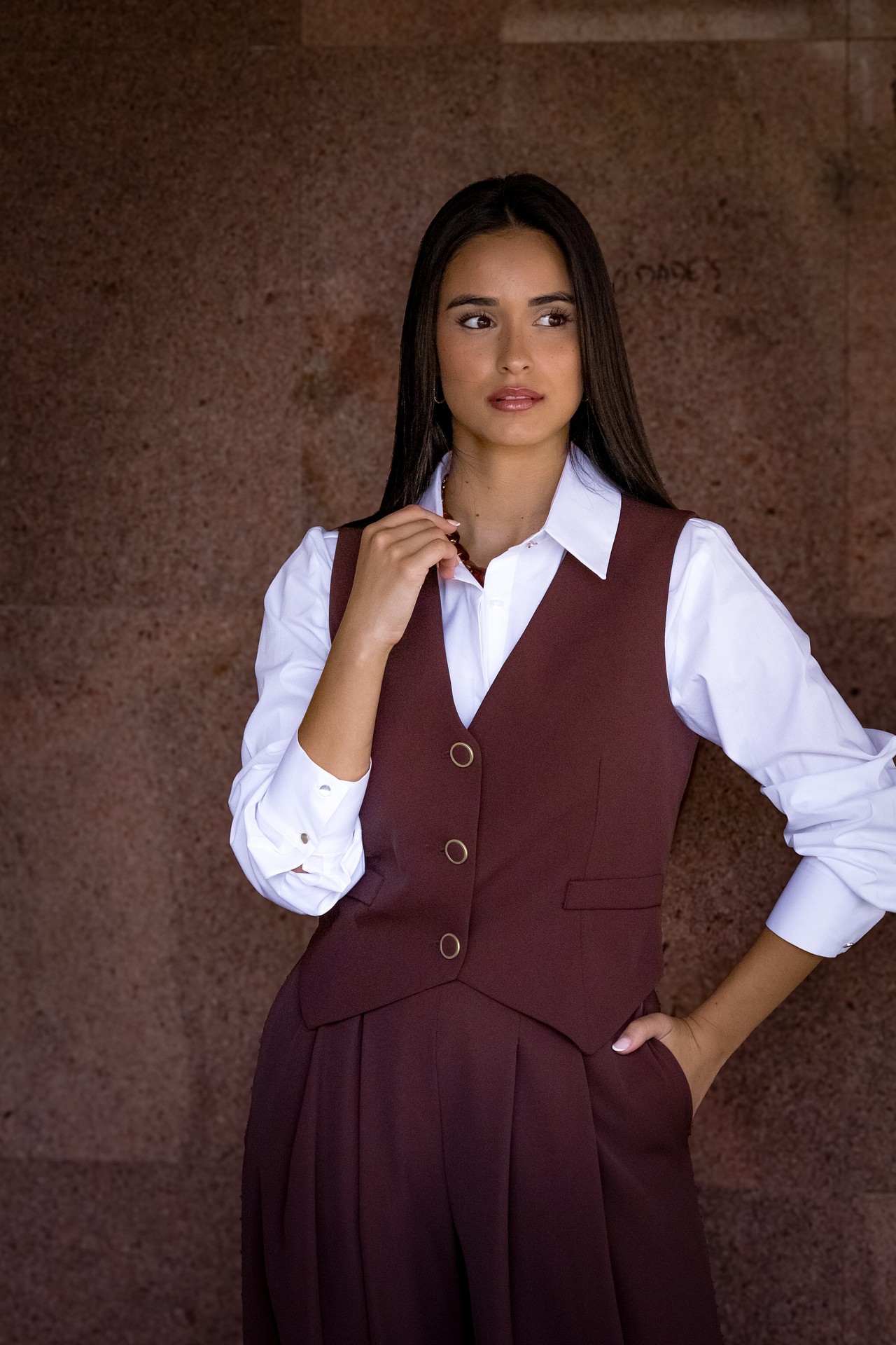 O Colete Chocolate Rinascimento é uma peça chave para compor looks modernos e sofisticados. Confeccionado em 97% poliéster e 3% elastano, com forro 100% poliéster, apresenta um corte estruturado que valoriza a silhueta e acrescenta elegância imediata a qualquer coordenado.