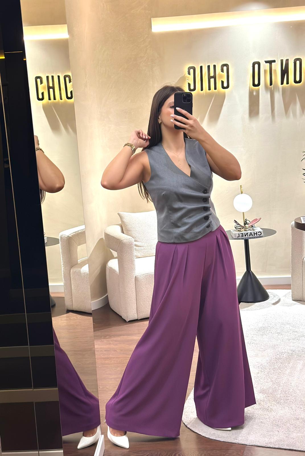 O modelo sem mangas destaca-se pelo decote em V, fecho frontal cruzado com botões e leve efeito drapeado que confere modernidade ao design. Nas costas, o detalhe metálico discreto reforça o acabamento sofisticado.