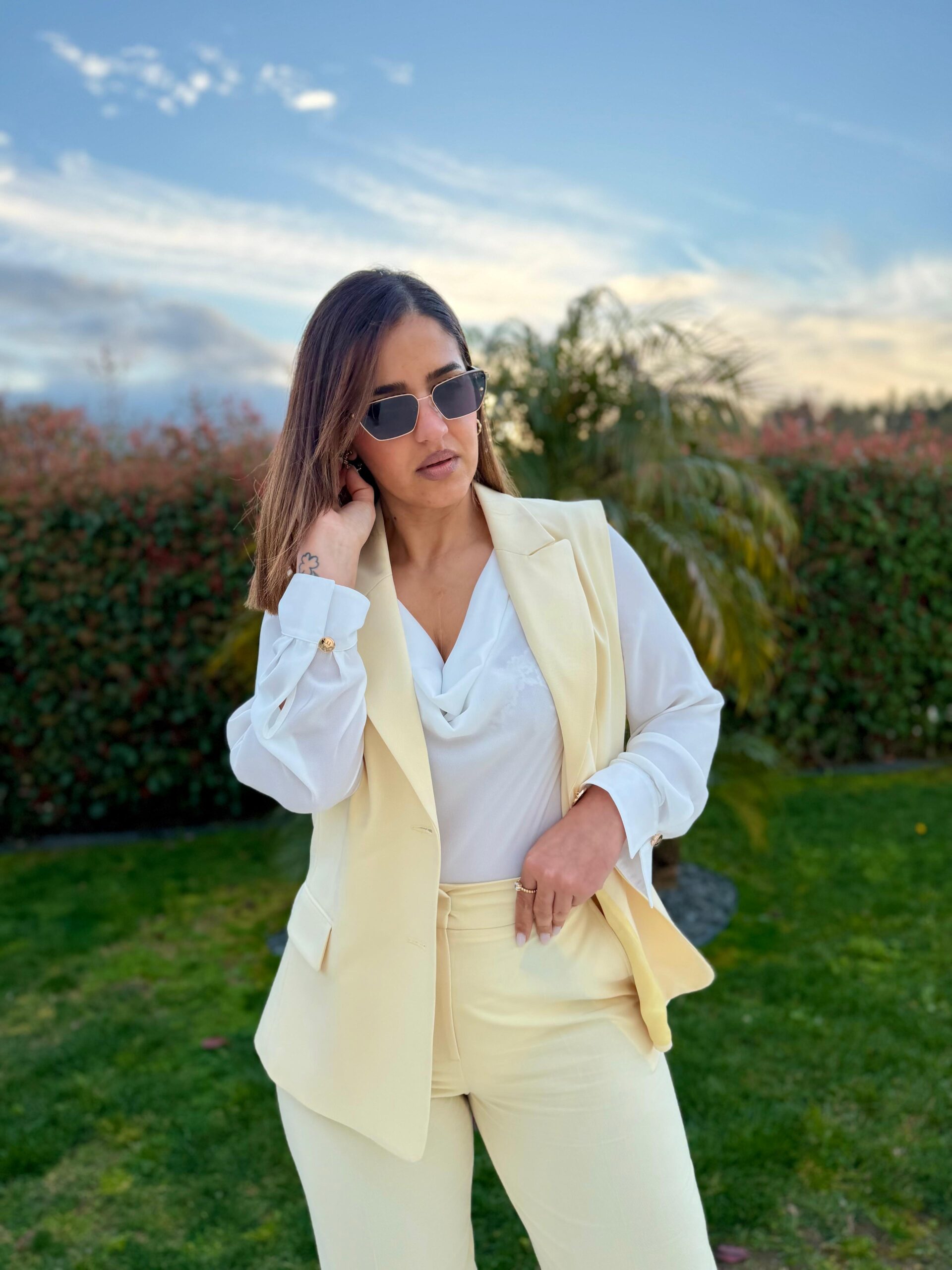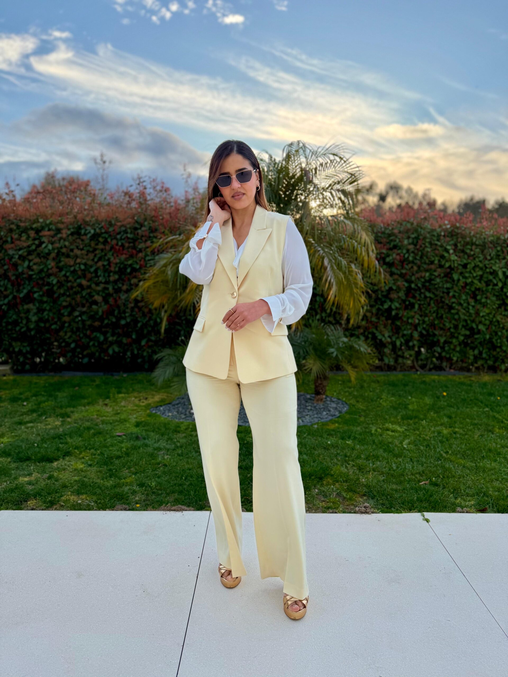 Colete de alfaiataria em tom amarelo claro, uma peça elegante e luminosa que combina o rigor da alfaiataria clássica com um design contemporâneo sem mangas. Confeccionado em tecido estruturado composto por 82% poliéster, 15% viscose e 3% elastano, oferece um equilíbrio perfeito entre estrutura, conforto e leve elasticidade.