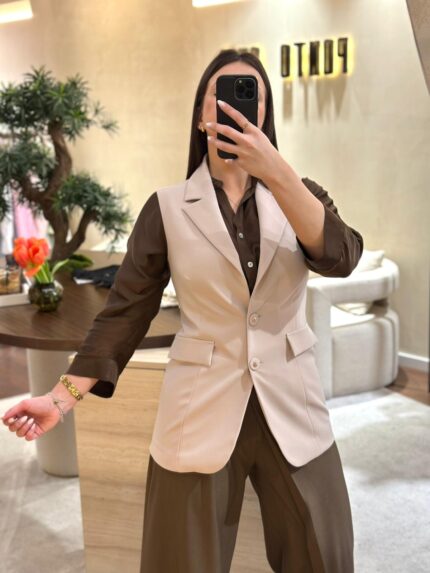Versátil e muito atual, pode ser usado sozinho para um look moderno e feminino ou combinado com as calças coordenadas para criar um conjunto de alfaiataria sofisticado.