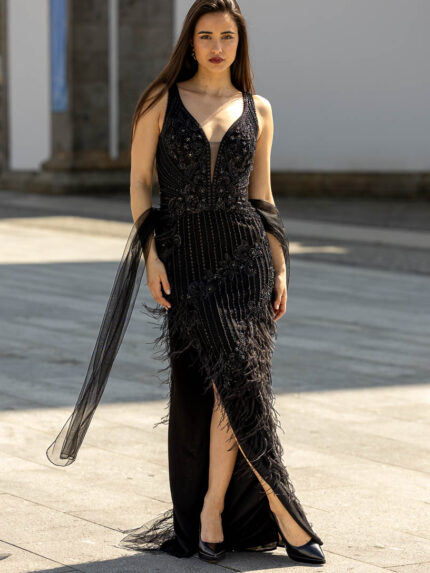 VESTIDO PRETO COM BRILHO E PENAS PONTO CHIC