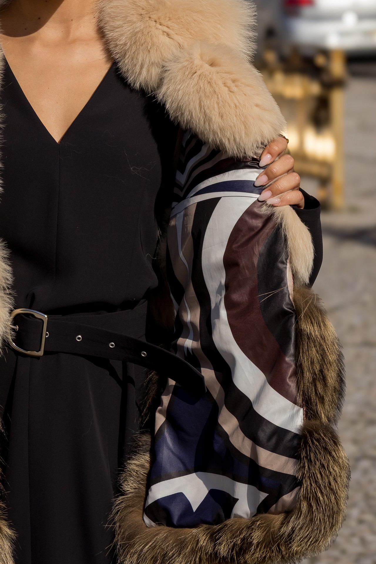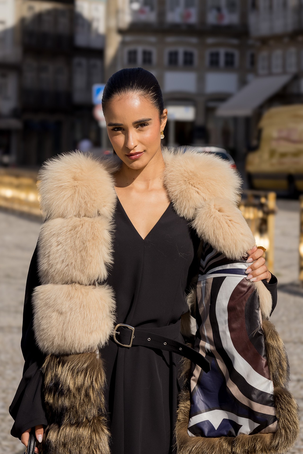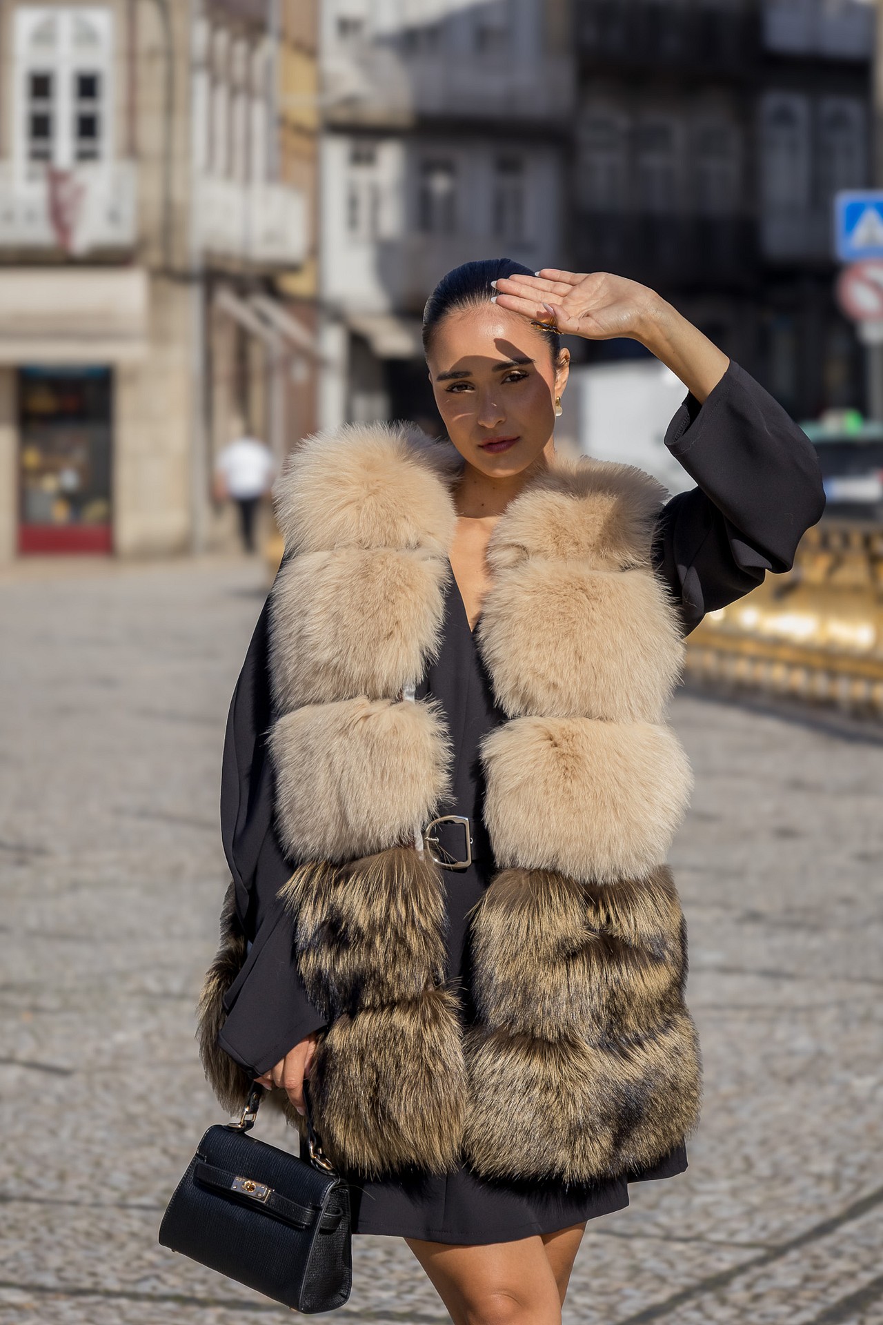 Com padrão bicolor em tons bege e castanho, apresenta um visual rico e tridimensional que destaca o pelo de efeito natural. Os fechos laterais com fivelas metálicas acrescentam um toque moderno e arrojado, permitindo ajustar o corte à silhueta.