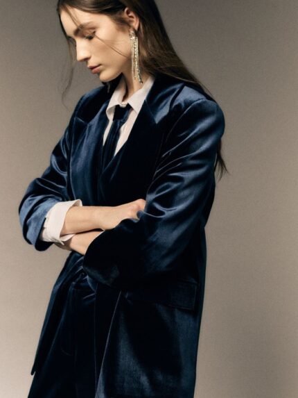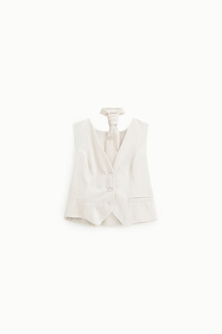 O decote em V alonga a silhueta e valoriza o colo, enquanto a gravata permite diferentes formas de styling, tornando a peça versátil e adaptável a várias ocasiões. O corte estruturado define a silhueta de forma elegante, sem comprometer o conforto, e a tonalidade bege confere luminosidade e intemporalidade ao conjunto.