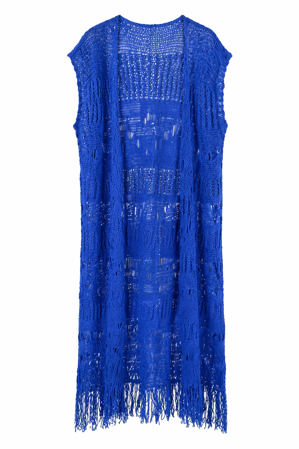 Apresenta um corte comprido e fluido, sem mangas, ideal para sobreposições. A malha aberta cria um jogo de transparências elegante e descontraído, perfeito para usar sobre biquínis, vestidos ou coordenados mais simples.