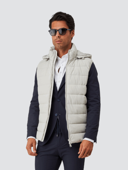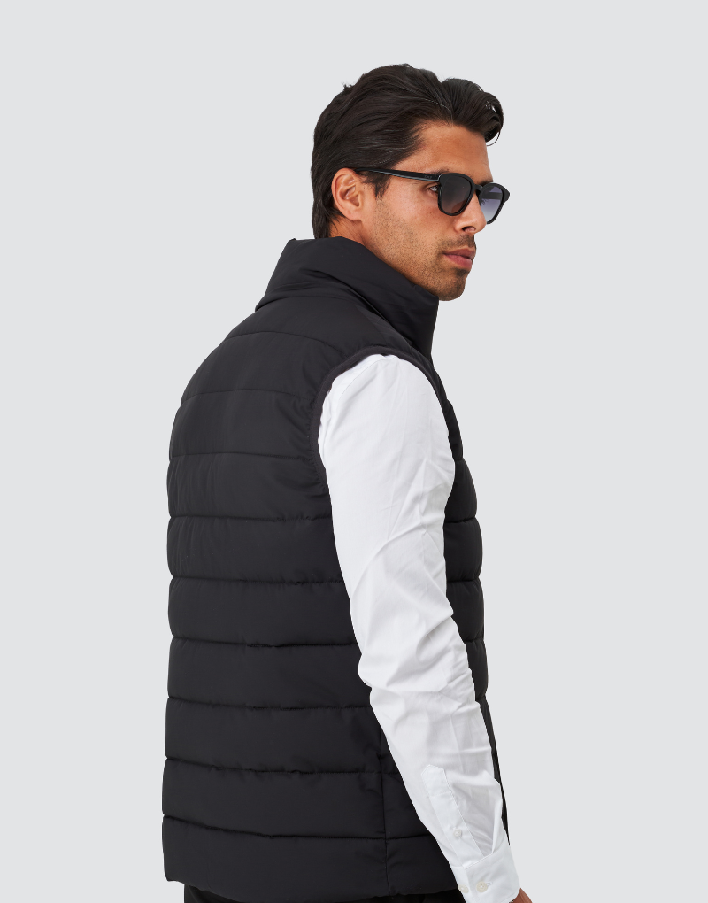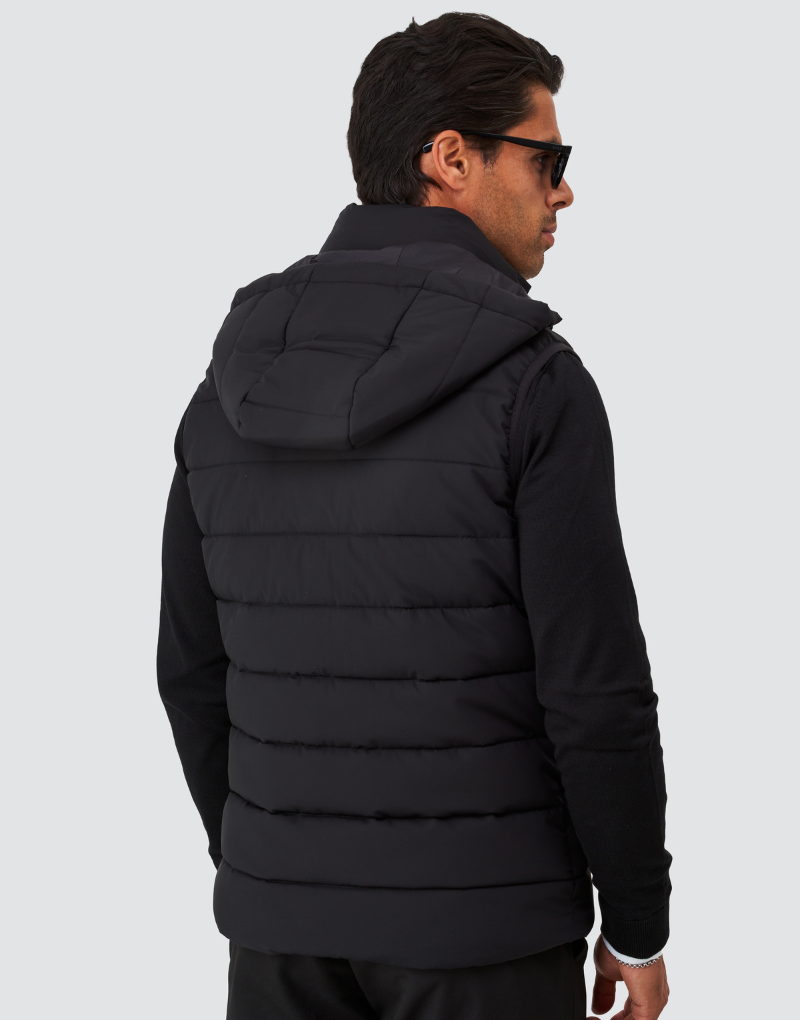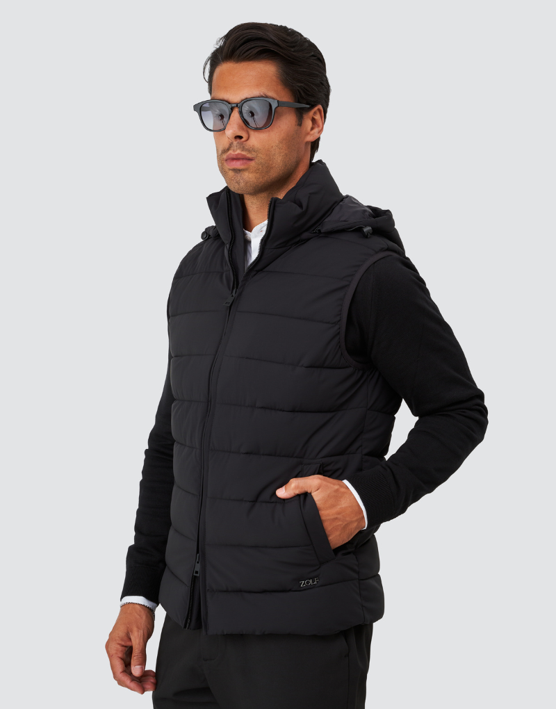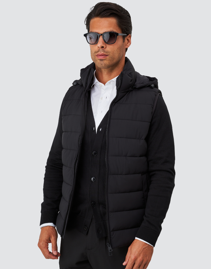 Com design acolchoado, capuz removível e bolsos laterais funcionais, é uma peça versátil que pode ser usada tanto em looks casuais como em coordenados mais urbanos. A tonalidade preta torna-o fácil de combinar, ideal para sobrepor sobre sweats, camisolas ou camisas, criando um visual moderno e descontraído.