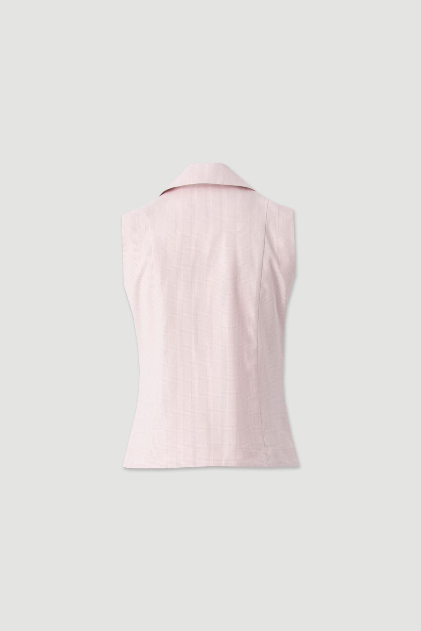Colete feminino de corte cintado com padrão xadrez subtil, que acrescenta textura e elegância ao design. Apresenta colarinho clássico e fecho frontal com botões metálicos personalizados. A silhueta estruturada valoriza a forma do corpo, criando um visual sofisticado e moderno, ideal para coordenados elegantes ou conjuntos de inspiração tailoring.