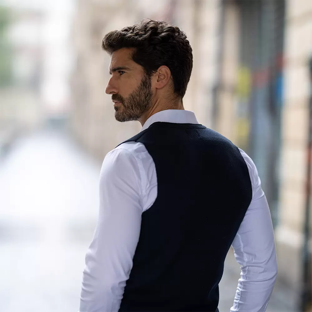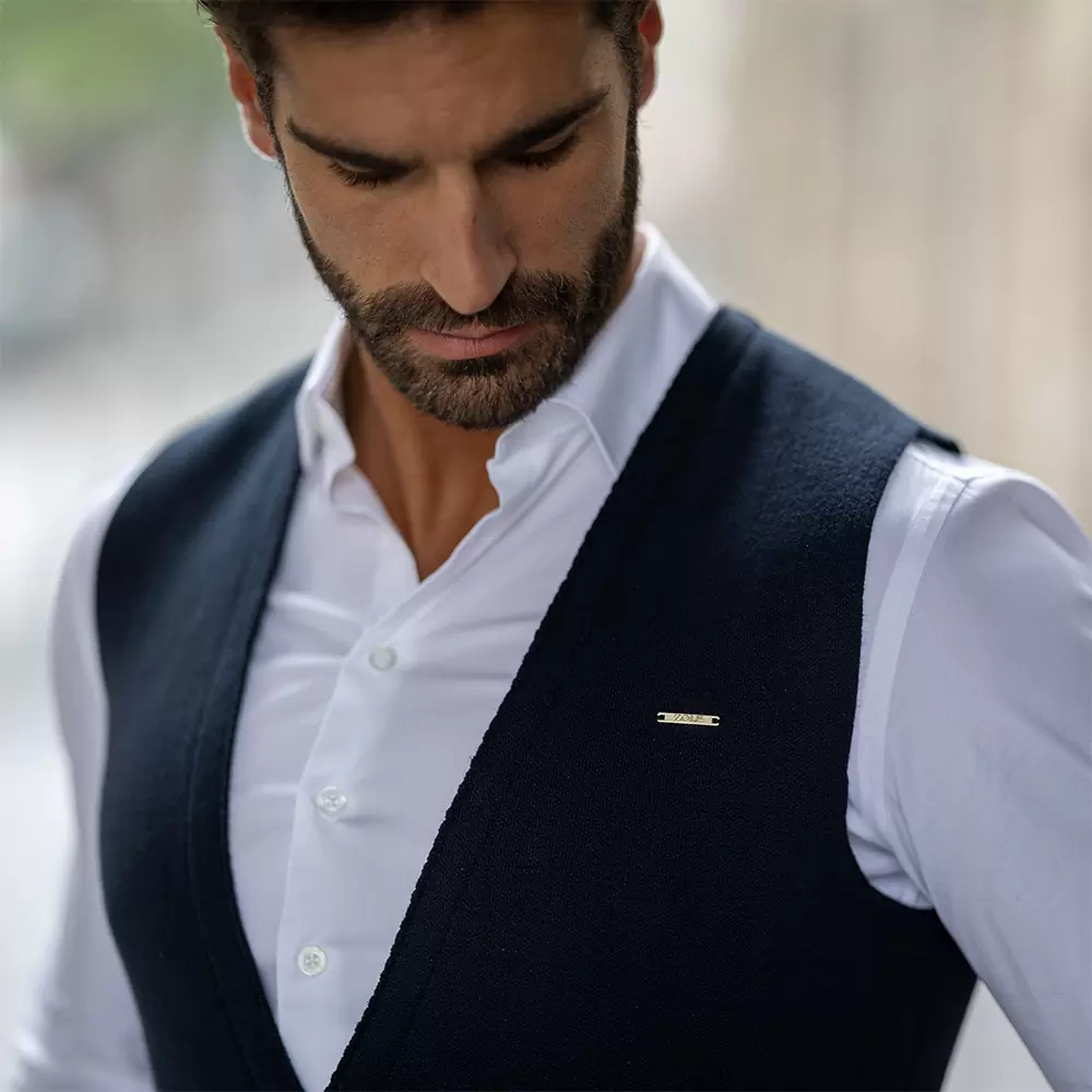 O design sem mangas, aliado à gola clássica em V, torna-o ideal para usar sobre camisas ou t-shirts, adaptando-se facilmente a contextos formais ou casuais. O tom azul profundo acrescenta um toque de sobriedade e sofisticação, perfeito para qualquer estação.