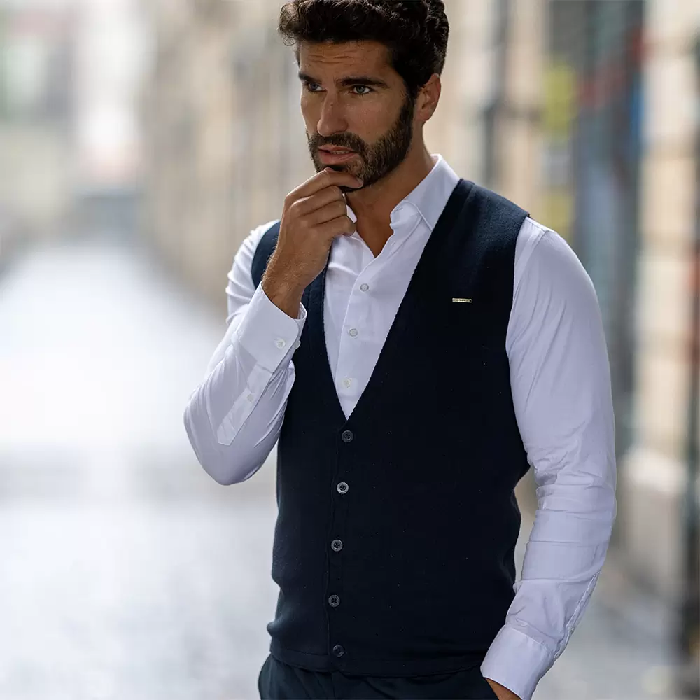 Fabricado em Portugal, o colete tricot Zolf representa o equilíbrio perfeito entre qualidade, conforto e elegância discreta.