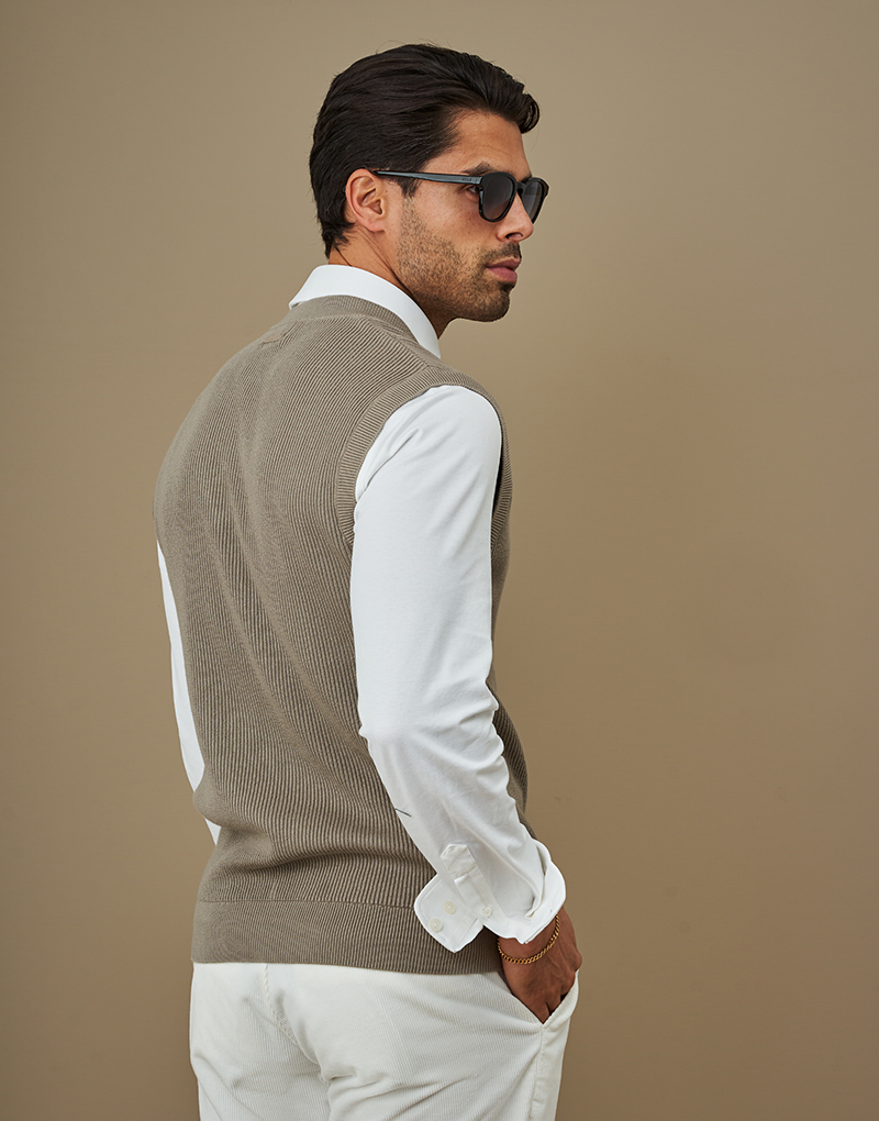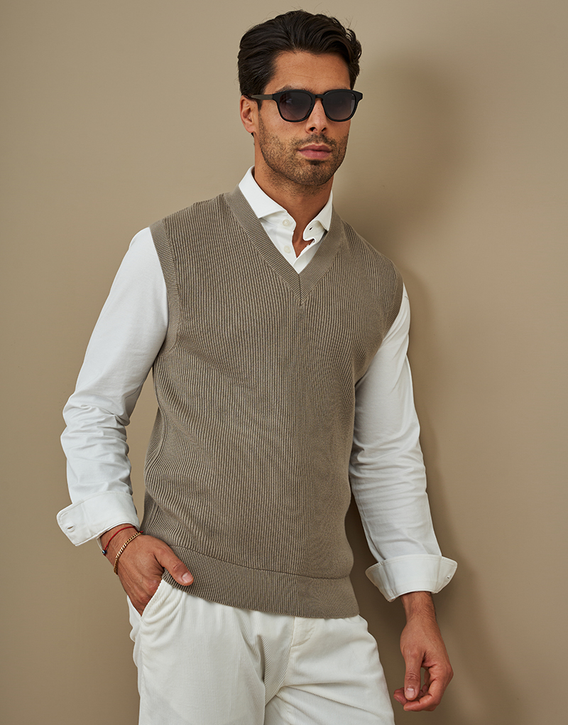 O design em malha canelada confere textura e estrutura à peça, enquanto o decote em V alonga visualmente a silhueta e permite múltiplas combinações. O corte direito e sem mangas torna este colete versátil e fácil de sobrepor a camisas, blusas ou vestidos, adaptando-se a diferentes estilos e estações.