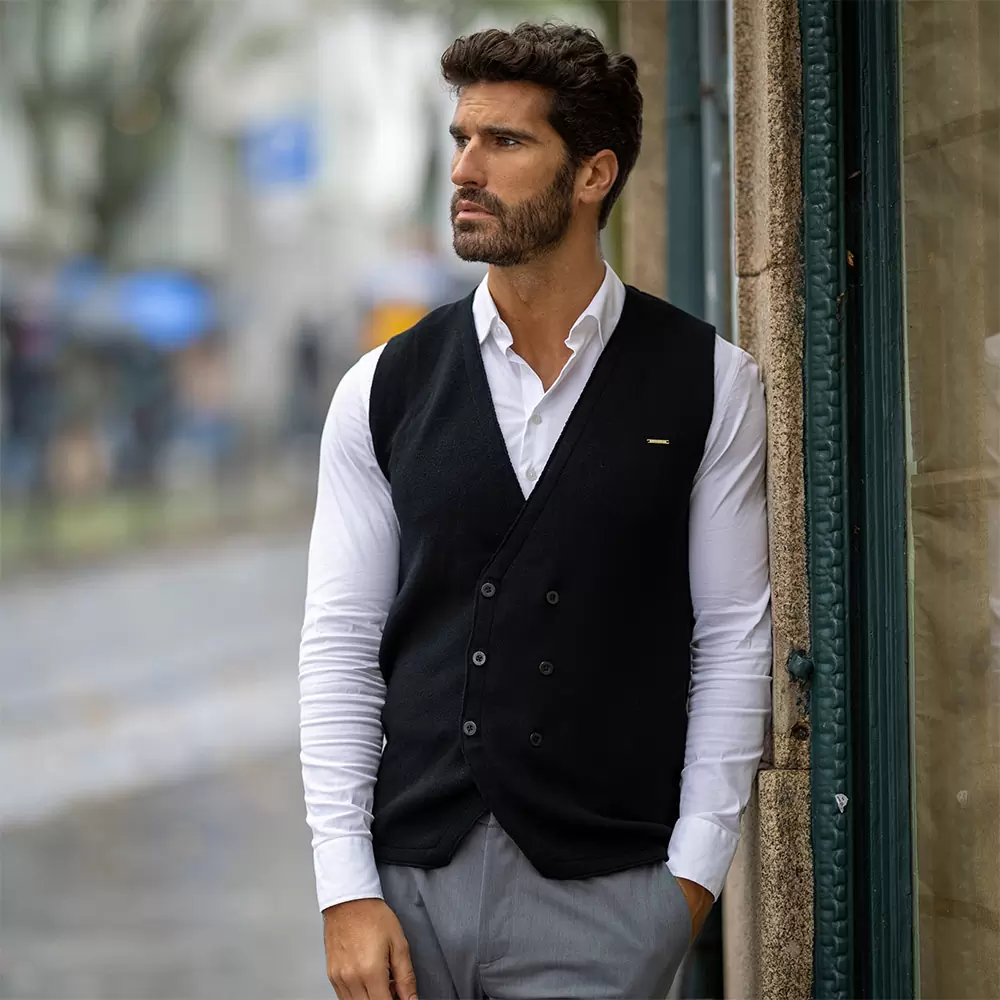 O design de trespasse confere um corte moderno e limpo, valorizando qualquer coordenado — seja sobre uma camisa clássica ou uma t-shirt casual. O tom preto profundo reforça a sua sobriedade e transforma-o num verdadeiro básico de luxo.