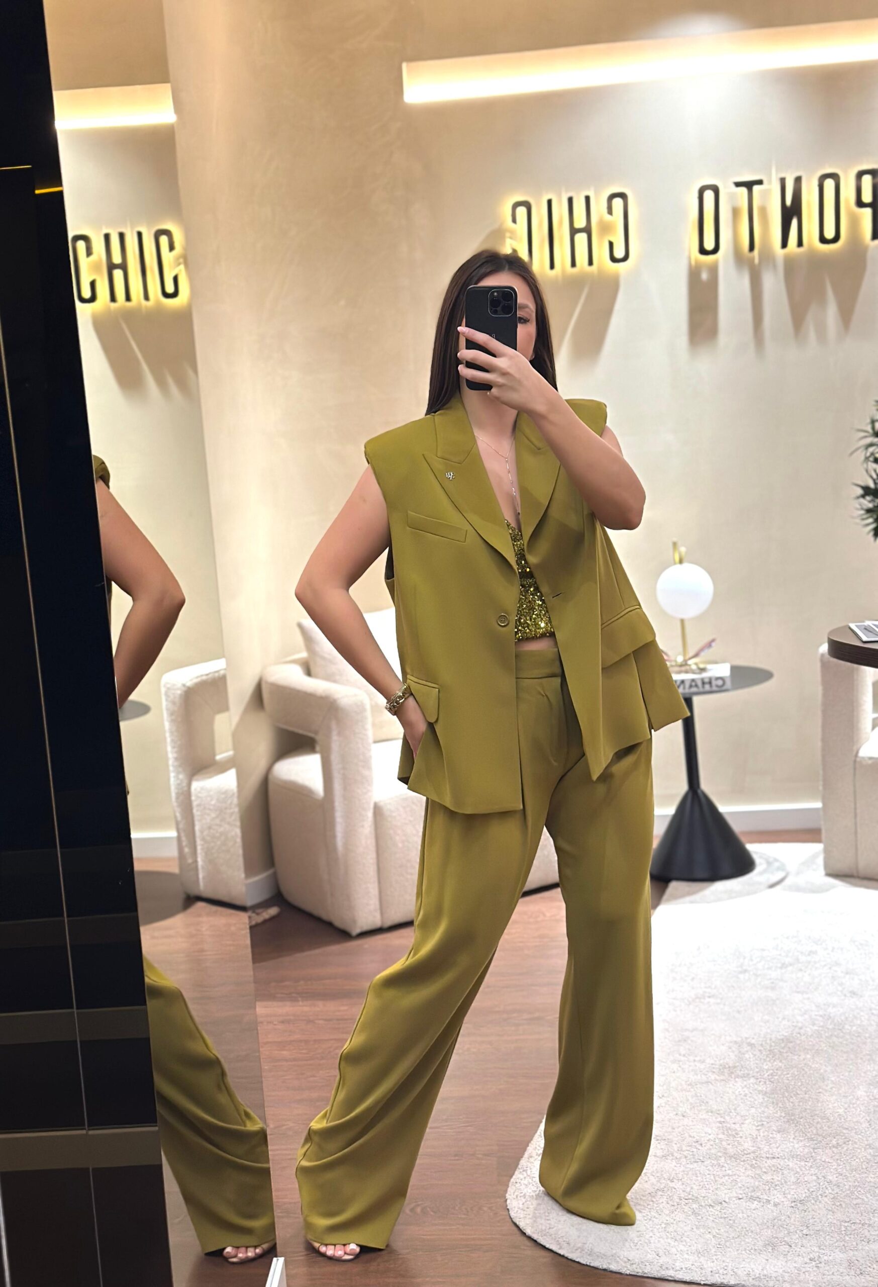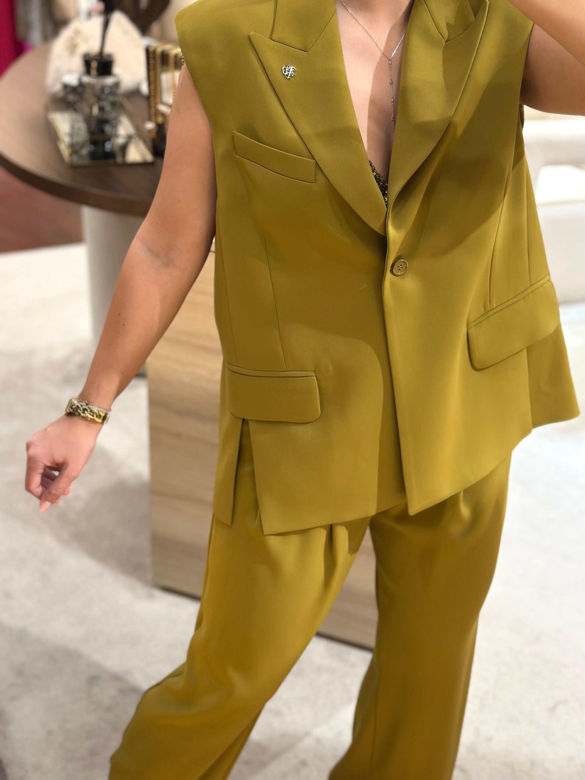 Colete na cor verde olivia , comprimento bastante agradável , composto tambem por dois bolsos na parte da frente . Destacando se as lapelas na parte da frente com o pormenor da chapa da marca . Pequena abertura na parte inferior das costas .