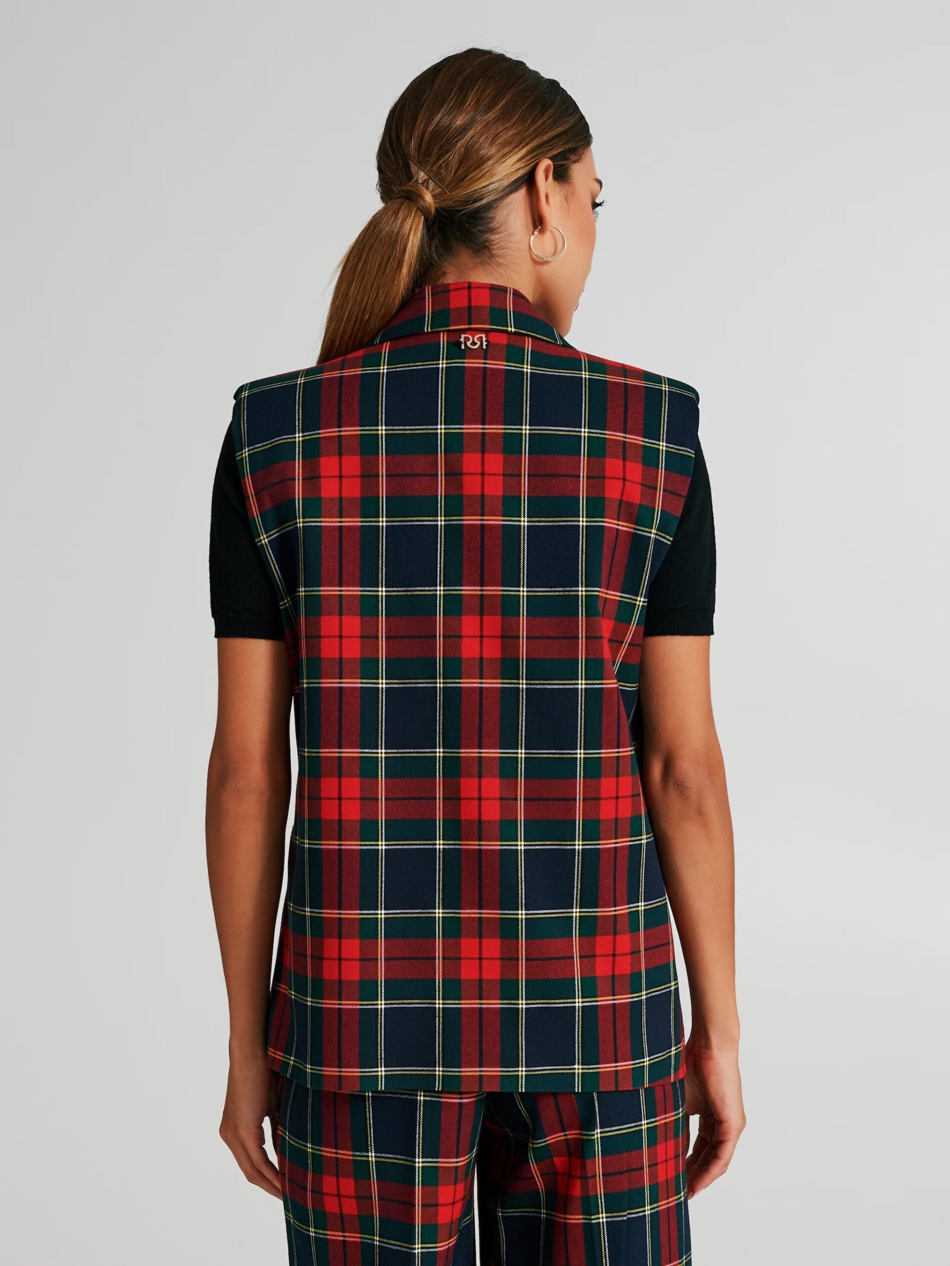 Com padrão tartan em tons de vermelho, azul-marinho e verde, este colete sem mangas apresenta lapela clássica, fecho frontal com botões e bolsos de aplicação, detalhes que reforçam a sofisticação da peça. O logo metálico discreto nas costas acrescenta um acabamento elegante.
