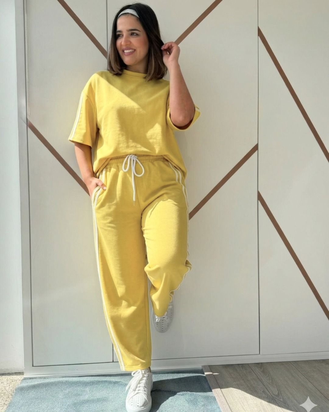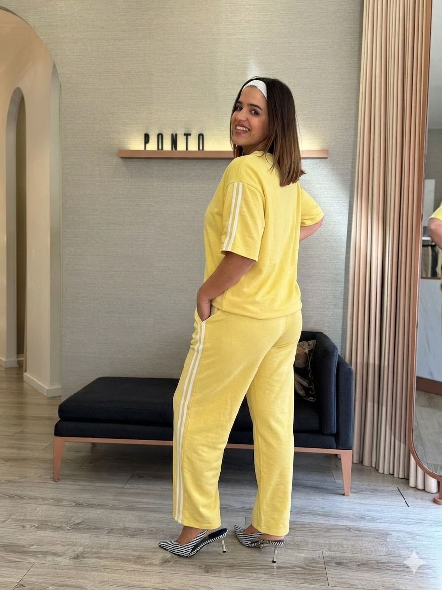 Conforto e estilo unem-se neste conjunto amarelo, perfeito para um look descontraído mas sempre atual. Composto por sweat de corte solto e calça com faixa lateral, é uma proposta moderna que combina bem-estar com uma estética desportiva e elegante.