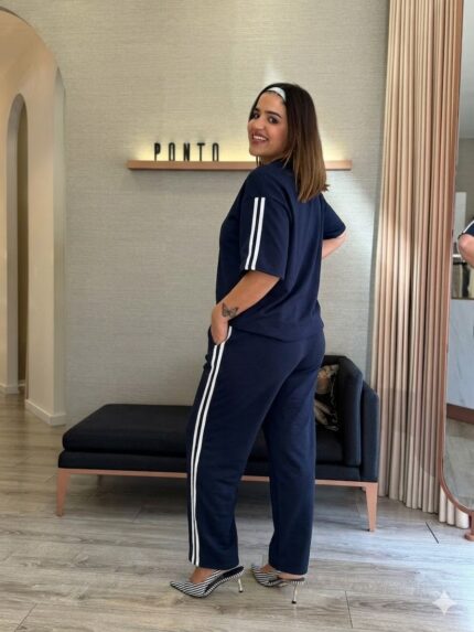 A sweat apresenta decote redondo e modelagem confortável, criando um visual minimalista e versátil. A calça destaca-se pelas duas faixas laterais em contraste, detalhe que alonga visualmente a silhueta e acrescenta um toque dinâmico ao conjunto.