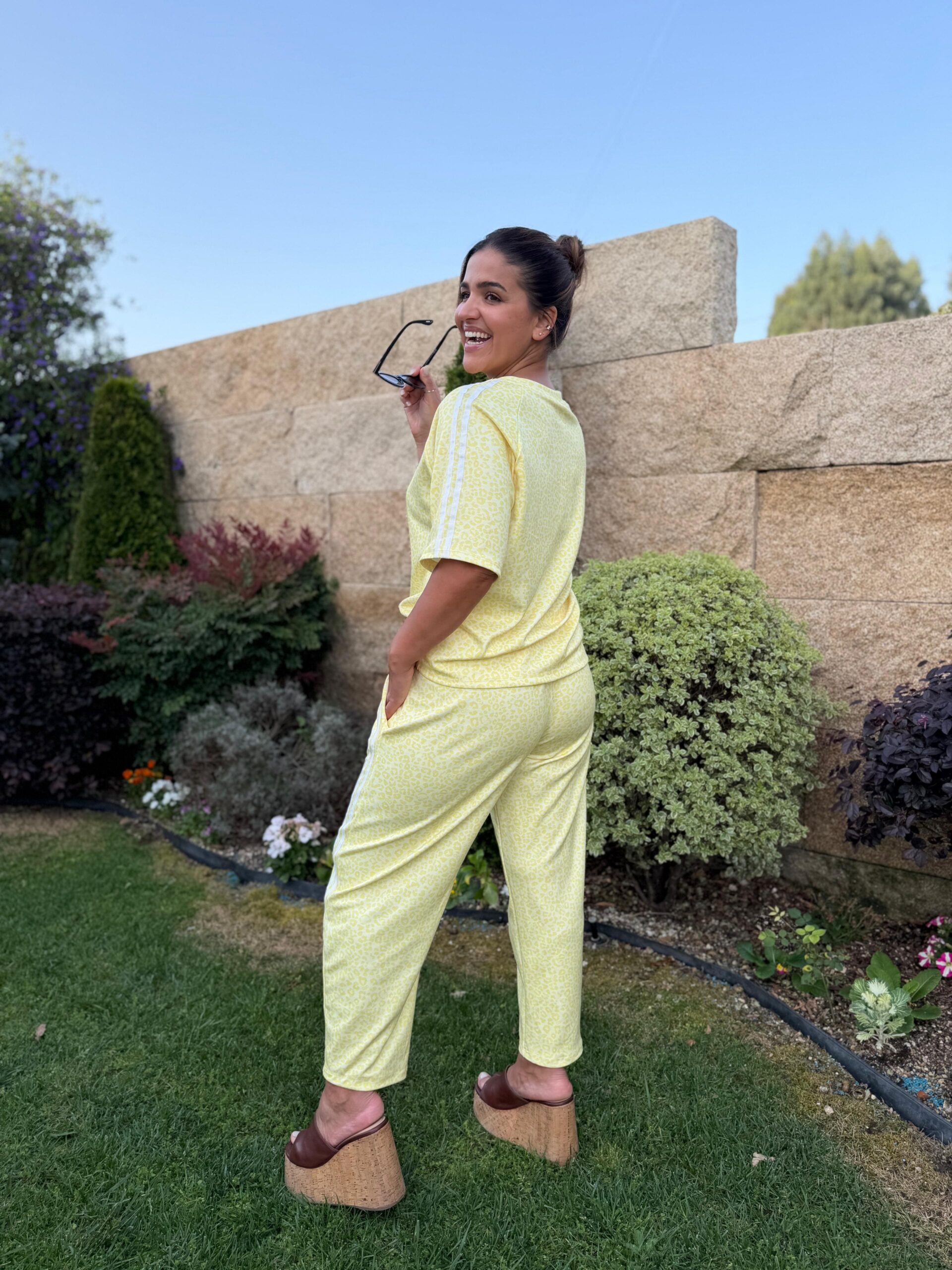 CONJUNTO AMARELO PADRÃO ANIMAL COM FAIXAS LATERAIS PONTO CHIC